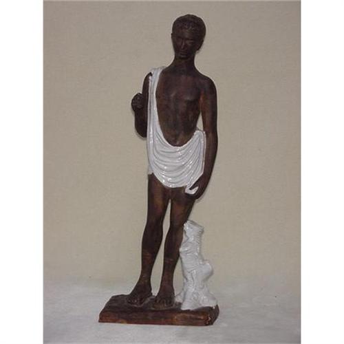 An 18" tall figure of a roman man wearing a white fabric draped over one shoulder and wrapped around his waist. Figure once held something in his raised hand, now missing. Marked as shown.