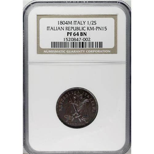 <B>Italian Republic. Napoleon 1/2 Soldo 1804M, </B></I>KM-Pn15, Proof 64 Brown NGC, a choice example of this bronze pattern with reflective surfaces and rich orange luster. This area with some additions was converted into the Kingdom of Napoleon in 1805.<BR><BR><b>Shipping:</b> Coin/Currency (<a target="_blank" href="http://www.heritageauctions.com/common/shipping.php">view shipping information</a>)