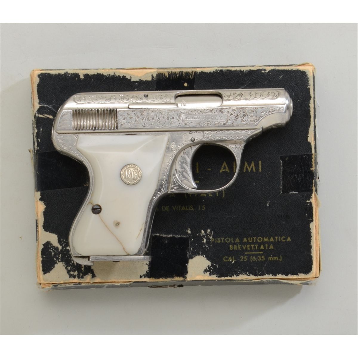 Italian Rigarmi semi-auto pocket pistol in original factory box with import tag, extensively engraved, 6.35mm cal., 2-1/4” barrel, nickel finish, faux pearl grips, #11913. This gun is in overall fine toexcellent condition showing approx. 95% original finish, nicely accomplished engraving, very good bore, crisp action, sharp markings including “1956” on right side of frame, grips are overall very good withan old crack in the right grip; box is overall fair + with tattering and losses and some re-enforcing by tape. Est.: $250-$500.