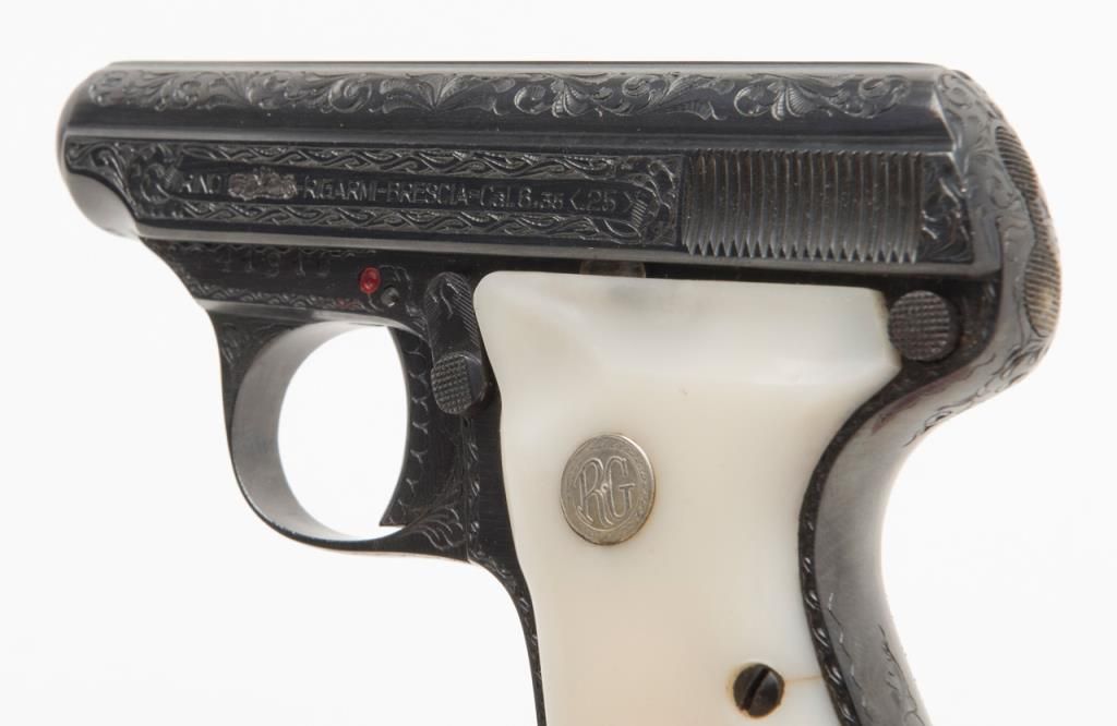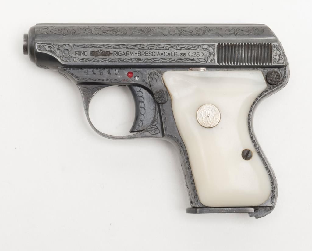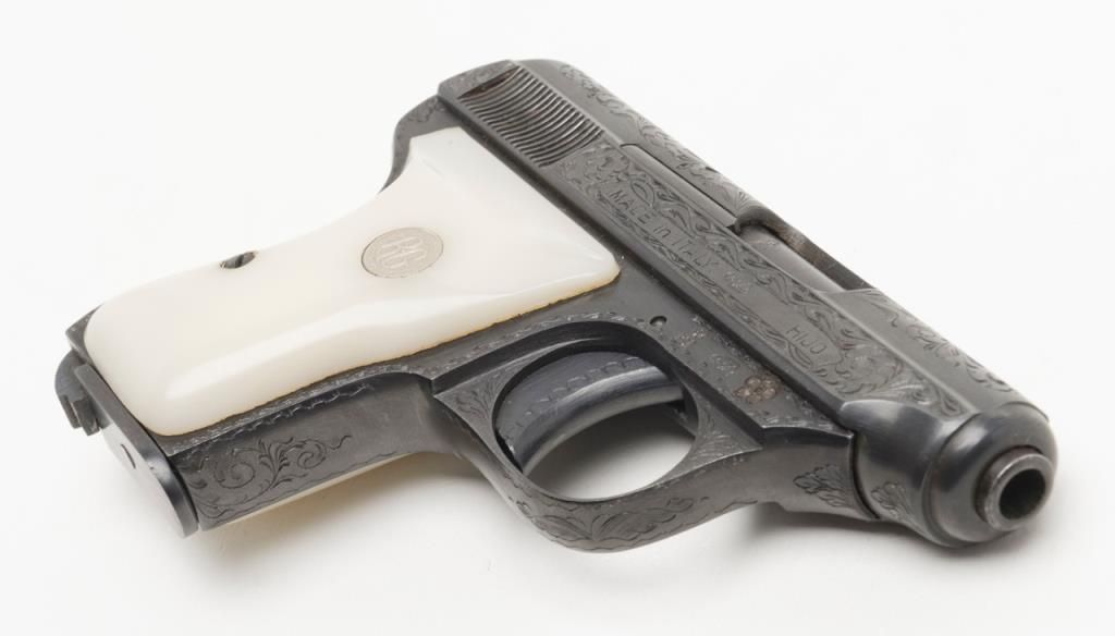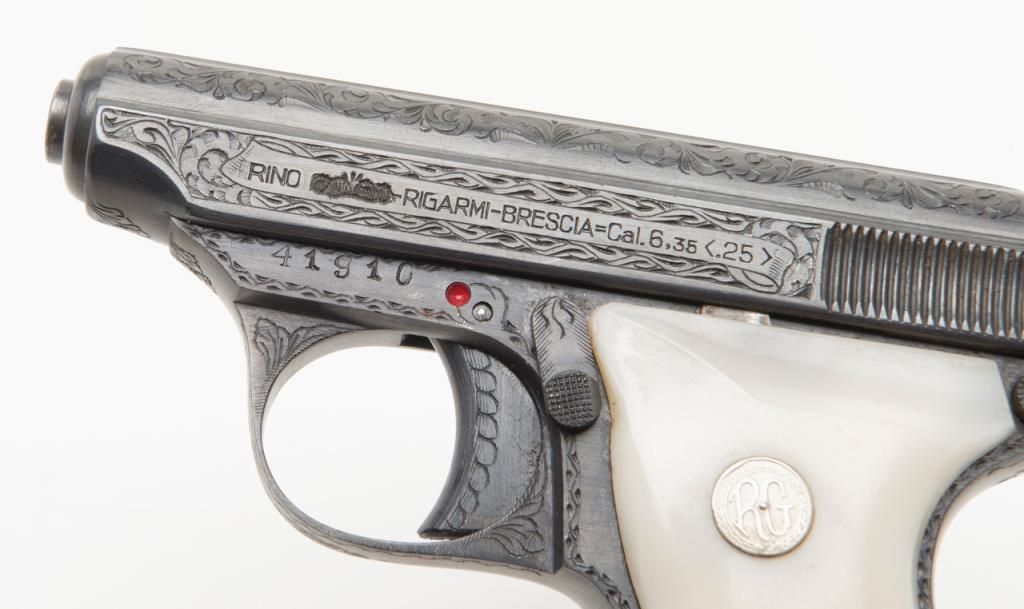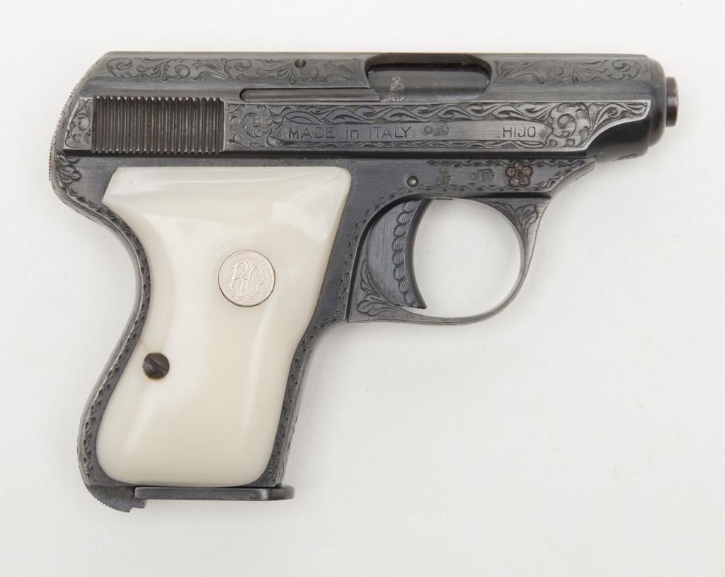 Italian Rigarmi semi-automatic pistol, 6.35mm caliber, Serial #41910. The pistol is in overall excellent condition with a 2” barrel. The pistol is factory engraved and in the original box. Retaining nearly all of its original blued finish, the pistol appears to have seen little use. The pistol features ivory colored plastic grips and one correct magazine. The pistol is available to FFL holders and individuals outside of California. No California sales on this lot. (Modern/PPT). Est.: $200-$400.