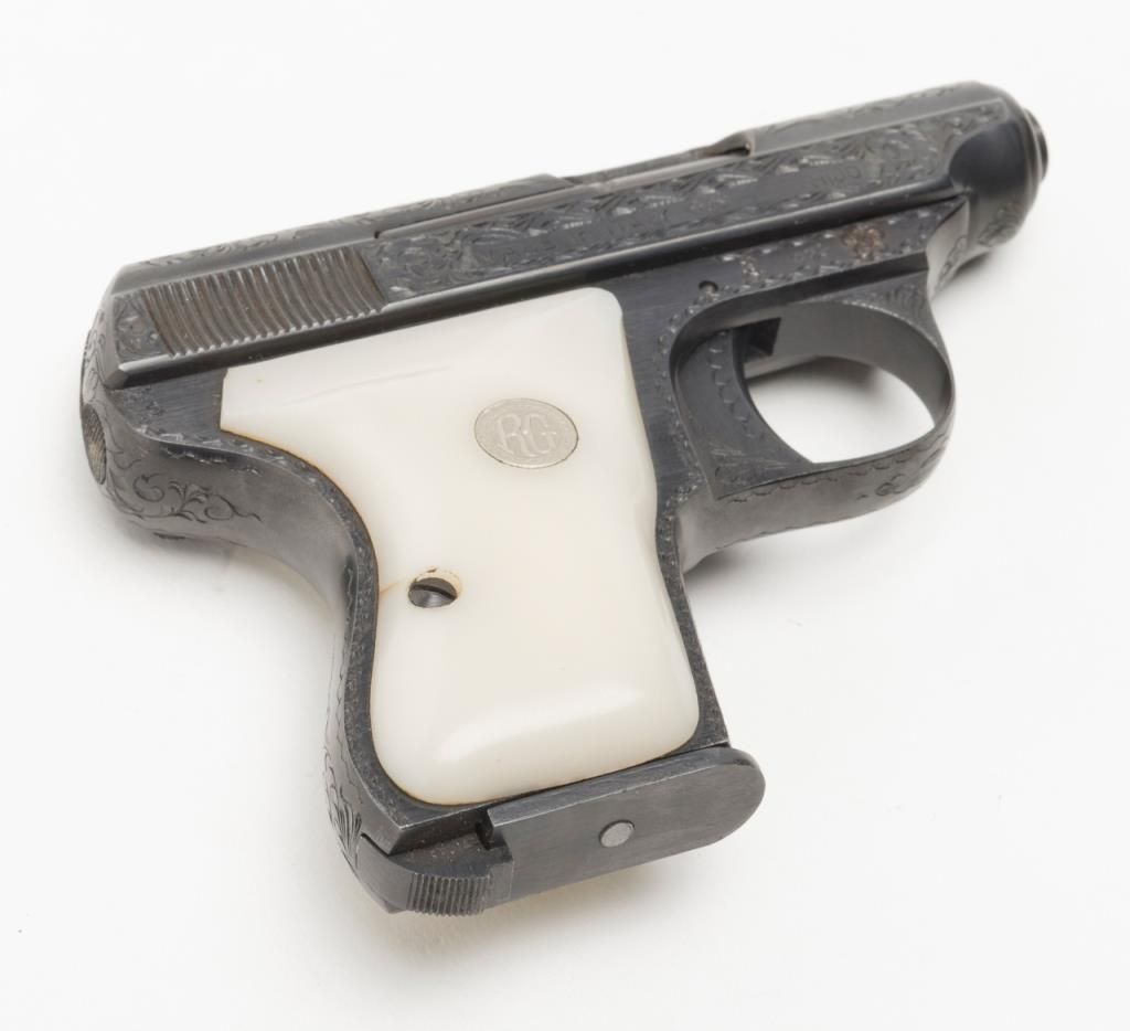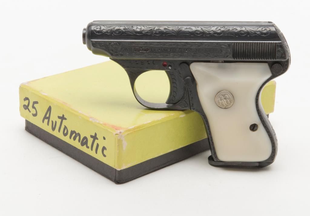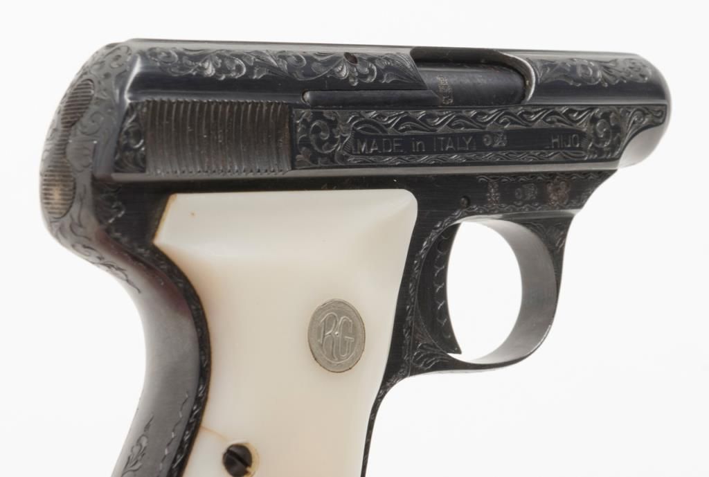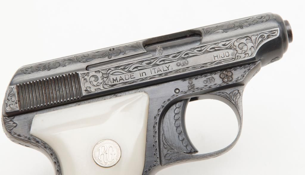 Italian Rigarmi semi-automatic pistol, 6.35mm caliber, Serial #41910. The pistol is in overall excellent condition with a 2” barrel. The pistol is factory engraved and in the original box. Retaining nearly all of its original blued finish, the pistol appears to have seen little use. The pistol features ivory colored plastic grips and one correct magazine. The pistol is available to FFL holders and individuals outside of California. No California sales on this lot. (Modern/PPT). Est.: $200-$400.