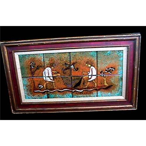 Outstanding Vintage Italian Majolica Tile Primitive Mural Painting Plaque by vorsalini titled "River Lolini" and colorfully depicts two woman ritualistically cleansing a cloth in the river beside the trees a bird in the air and a fish beside, them giving the suggestion of fertility and rebirth. This piece would make a unique addition to any fine kitchen or household.