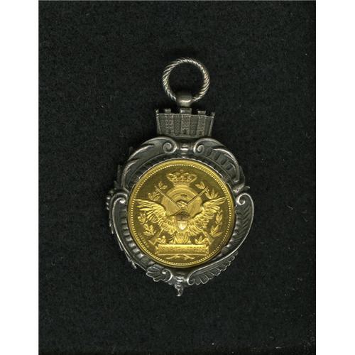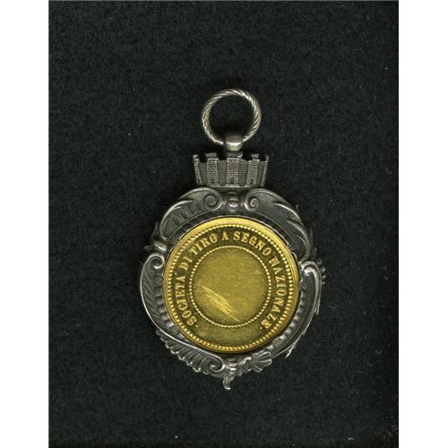 <B>Italian Silver and Gold Shooting Medal.</B></I> An Italian shooting medal with a silver outer ring and a gold center, circa 1880s. The ornate outer ring has a castle crown at the top; the center piece on one side has an eagle in the center with a target behind it, along with crossed rifles. In the center of the eagle is a cross, below the words PRO PATRIA ET REGE. The reverse has SOCIETA DI TIRO A SEGNO NAZIONALE. Weight is about 17.5 gm. A nice shooting medal that would appeal to many different collectors.<BR><BR><b>Shipping:</b> Coin/Currency (<a target="_blank" href="http://www.heritageauctions.com/common/shipping.php">view shipping information</a>)
