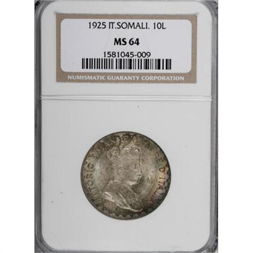 <B>Vittorio Emanuele III 10 Lire 1925R,</B></I> KM8, MS64 NGC, choice old-time toning, light contact marks on the obverse. A handsome example of this very popular type.<BR><BR><b>Shipping:</b> Coins & Currency (<a target="_blank" href="http://www.heritageauctions.com/common/shipping.php">view shipping information</a>)