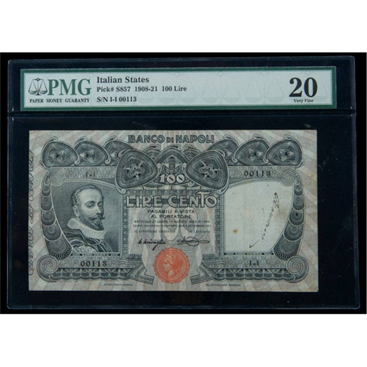 Italian States, Banco di Napoli, SCWPM# S857, 1908-21 100 Lire. PMG Very Fine 20. . Fr-P-S857. This is a scarce private bank issue that is very rare in higher grades. A single small toning spot is mentioned for accuracy.