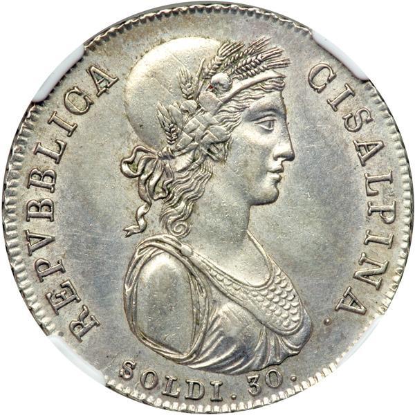 Italian States - Cisalpine Republic. 30 Soldi, Anno IX (1801). KM-1; Pagani-9. Revolutionary State. Bust right. Reverse: 5-line inscription. NGC graded AU-55.