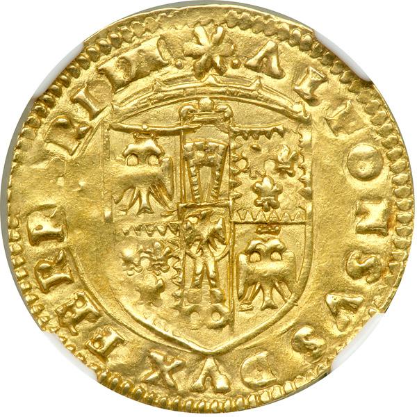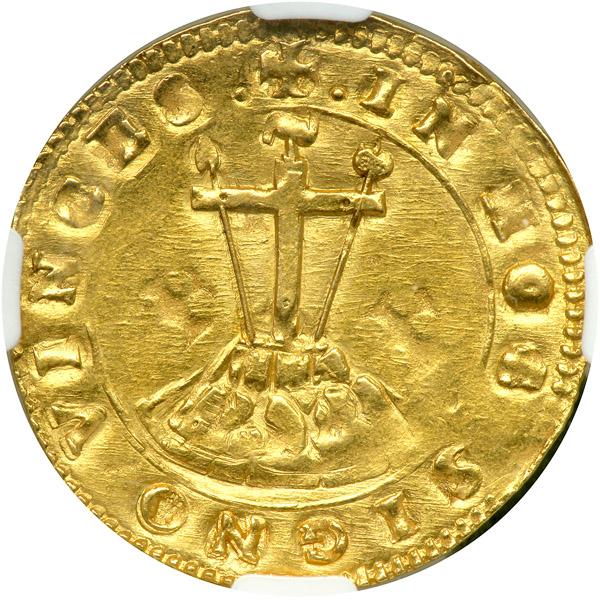 Italian States - Ferrara. 1 Scudo d'oro, ND. Fr-269. Alfonso I D'Este, 1505-1534. Arms. Reverse: Calvary cross. Lustrous. NGC graded AU-55.
