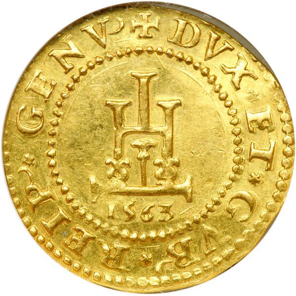 Italian States - Genoa. ½ Doppia, 1563. Fr-420; CNI III, p.263.2. The Biennial Doges, 1528-1797. Castle within beaded inner circle, date under castle. Reverse: Cross pattee. Nice original mint fresh luster. This is an exceptional example of the type. NGC graded MS-61.