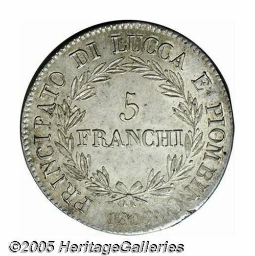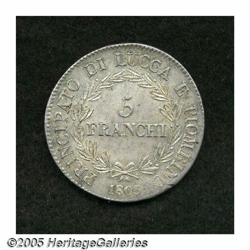 <B>Lucca. Felix and Elisa 5 Franchi 1805, </B></I>KM24, choice toned AU-UNC, beautiful gray-gold patina, minor adjustment marks on the outer edge only.