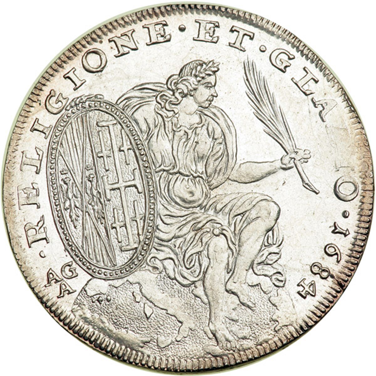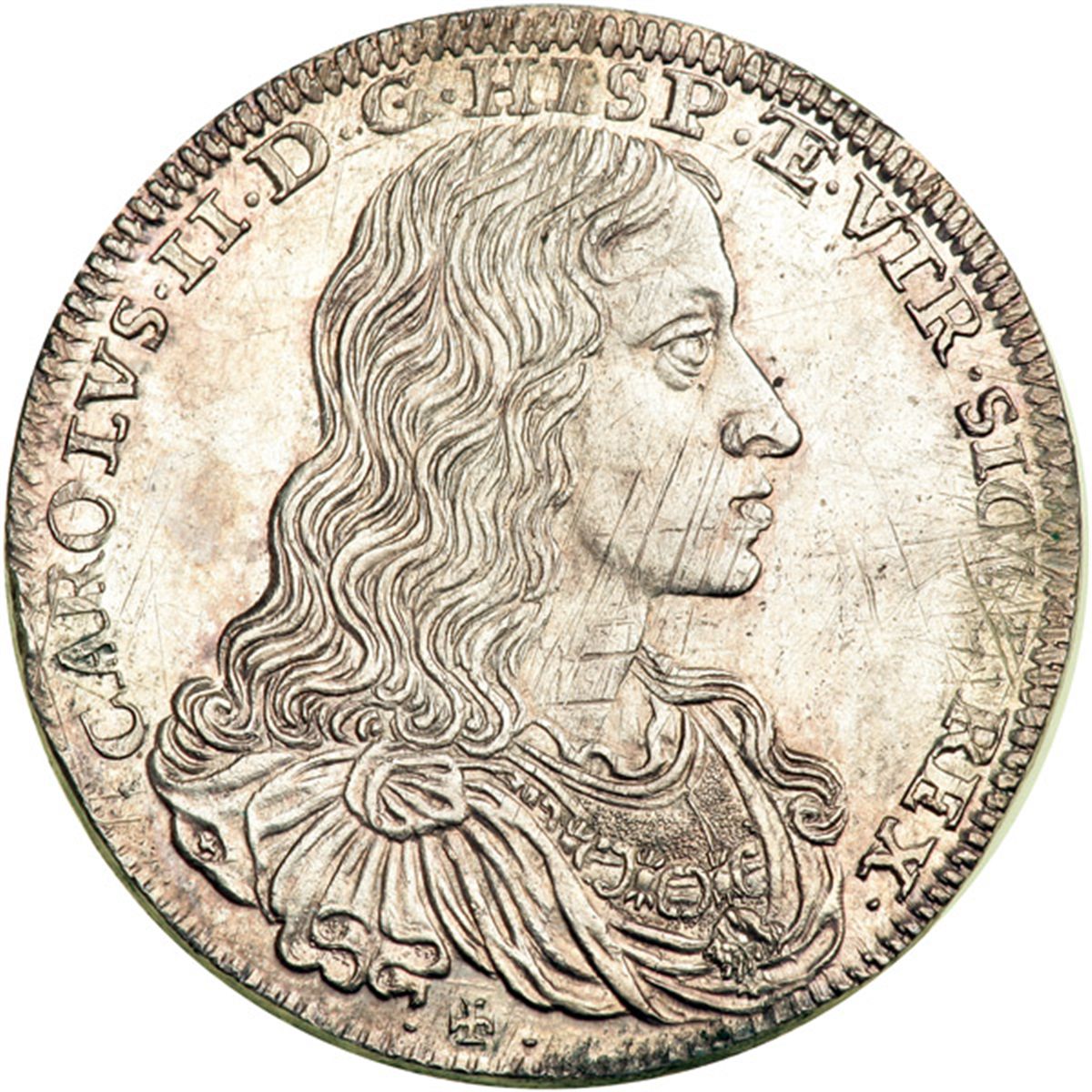 Italian States - Naples. ½ Ducato, 1684-AG / A. CNI-pl.XVII,5. Charles II of Spain, 1665-1700. Bust right. Reverse: Woman seated on globe holding shield. Light adjustment marks. Original mint luster with light golden toning. NGC graded MS-62.