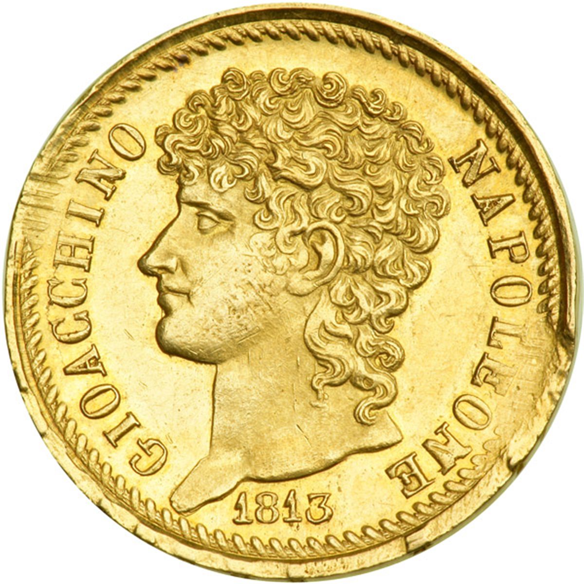 Italian States - Naples. 40 Lire, 1813. Fr-859; Pagani-55; KM-C113. Gioacchino Murat, 1808-185. Head left. Reverse: Value within wreath. Edge weakness due to strike. Bold luster and very scarce in grade. NGC graded MS-61.