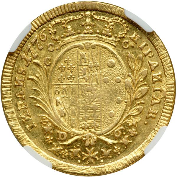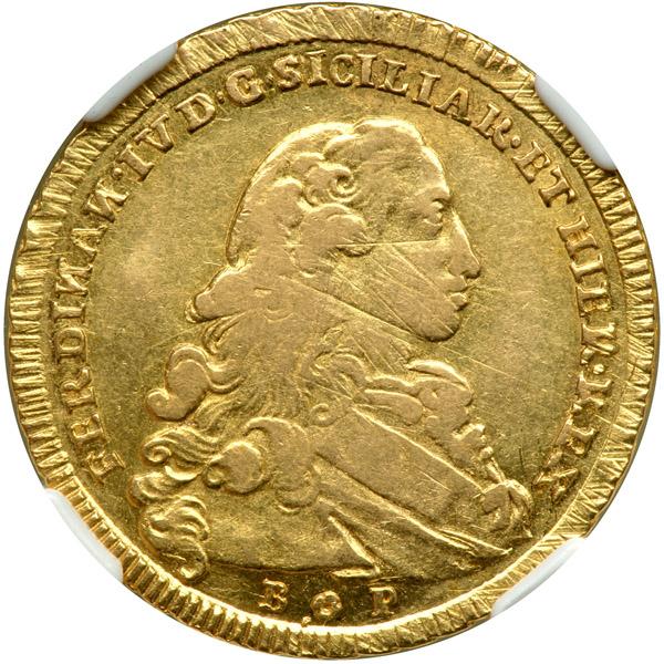 Italian States - Naples. 6 Ducati, 1776-BP. Fr-849; KM-C76. Ferdinando IV. Bust right. Reverse: Crowned arms within sprays. Popular date for collectors. NGC graded EF-40.