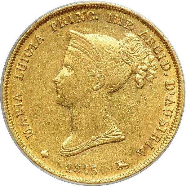 Italian States - Parma. 40 Lire, 1815. Fr-933; KM-C32. Weight 0.3733 ounce. Maria Luigia (Maria Louise), 1815-1847. Head left. Reverse: Arms. PCGS graded AU-53.