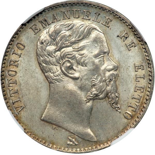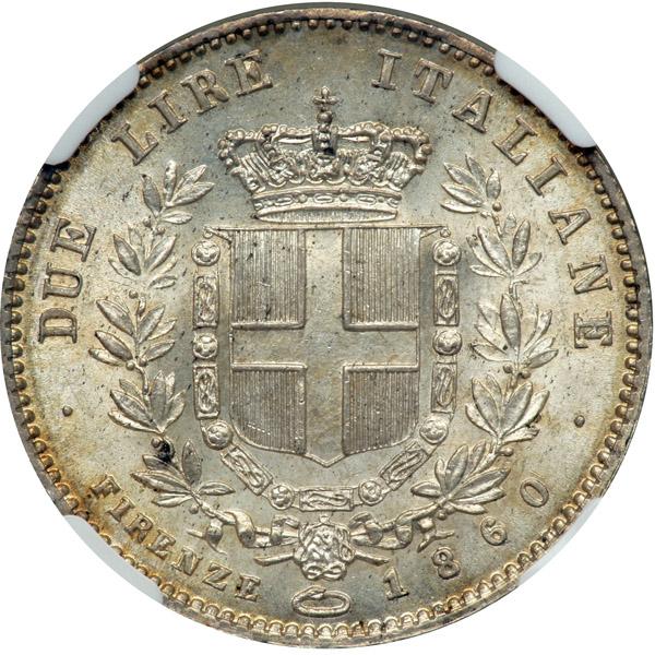 Italian States - Tuscany. 2 Lire, 1860 (Firenze). KM-C86; Pagani-436 (R). Second Provisional Government. Vittorio Emanuele II. Head right. Reverse: Crowned shield. A lovely original example with mint fresh luster and a hint of golden toning. Rare this nice. NGC graded MS-64.