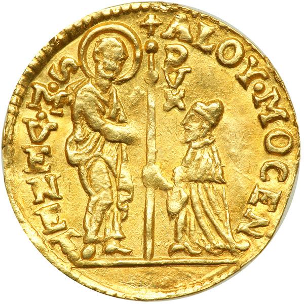 Italian States - Venice. ½ Zecchino, ND. Fr-1359. Alvise Mocenigo II, 1700-1709. Doge kneeling before standing figure of St. Mark. Reverse: Christ standing within stars. NGC graded About Uncirculated, Details (Mount Removed).