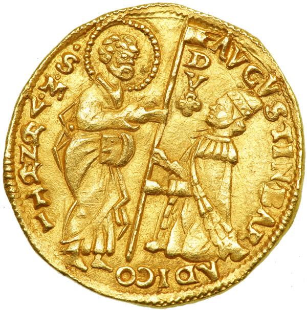 Italian States - Venice. Ducat, ND. Fr-1241. Agostino Barbarigo, 1486-1501. Doge kneeling before standing figure of St. Mark. Reverse: Christ within stars. NGC graded MS-63.