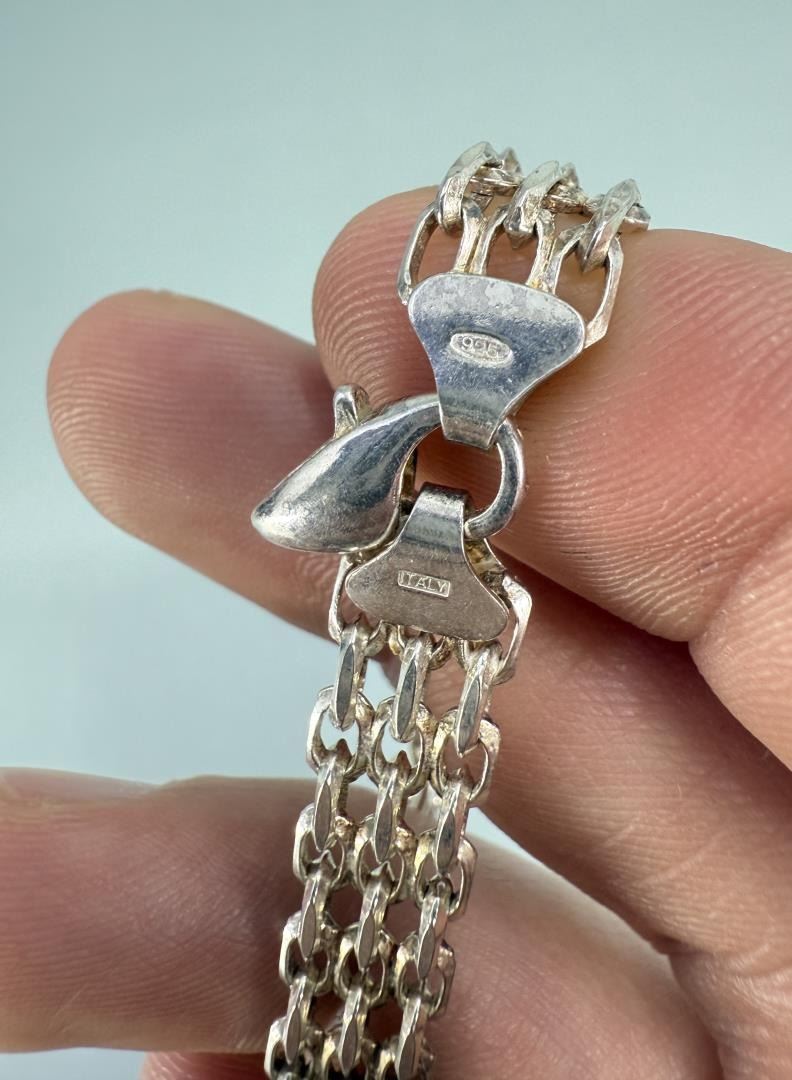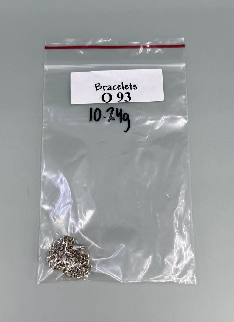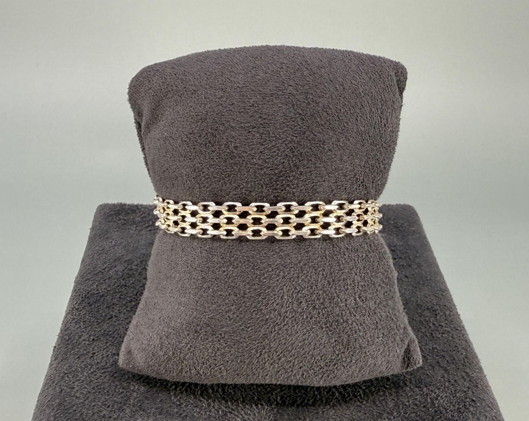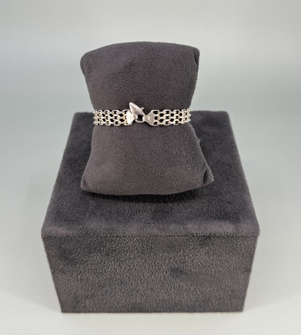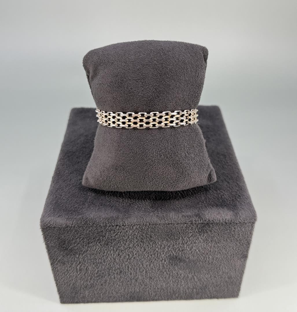 Three row flat link. 6 7/8" open. 10.24 grams. Missing link.