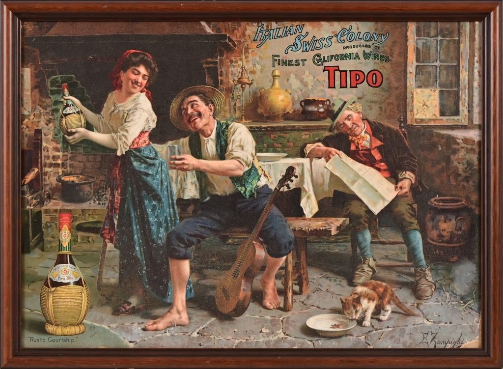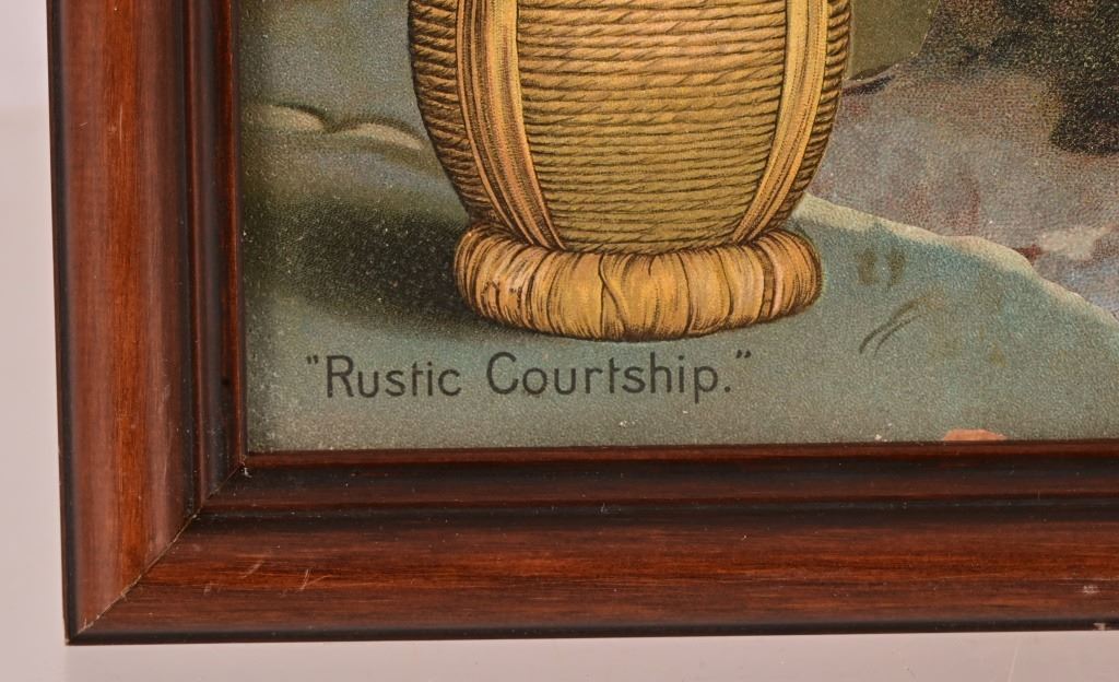 " Rustic Courtship". Producers of Finest California Wines Tipo. Image measures 22 3/4" x 16 1/4". Frame measures 25" x 3 1/8".