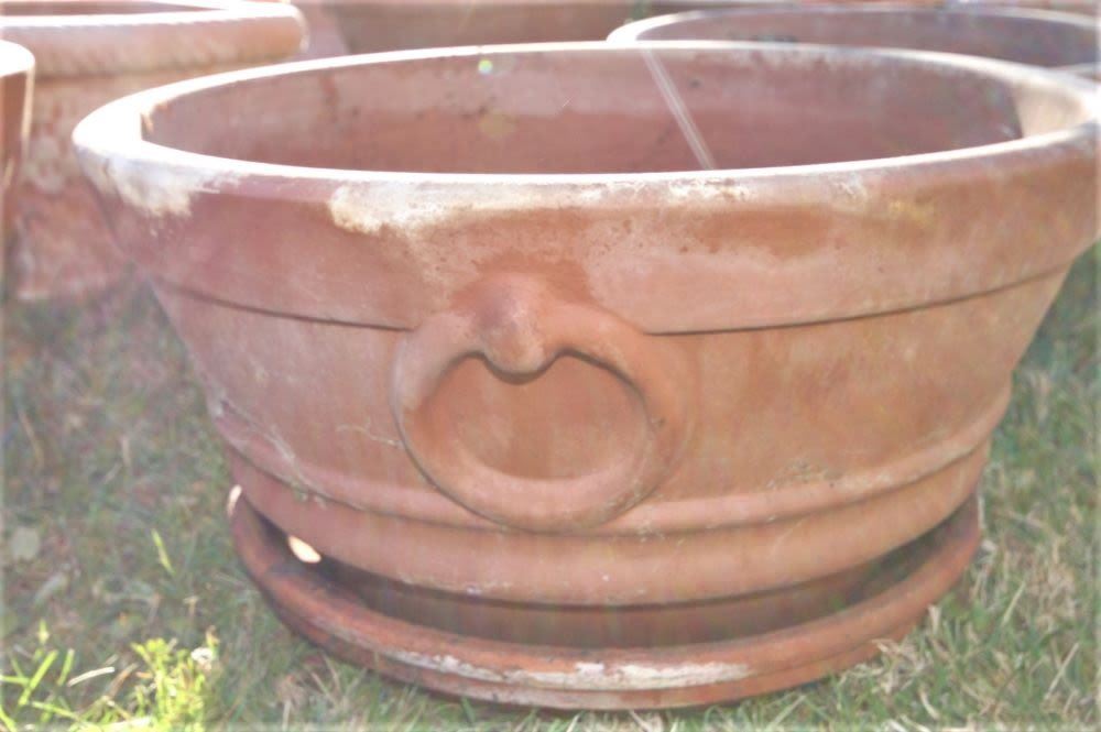 These Italian Terracotta pots are amazing detail of the rings on each side, beautiful. Dimensions 10 1/2 " H x 19" across middle of planter.