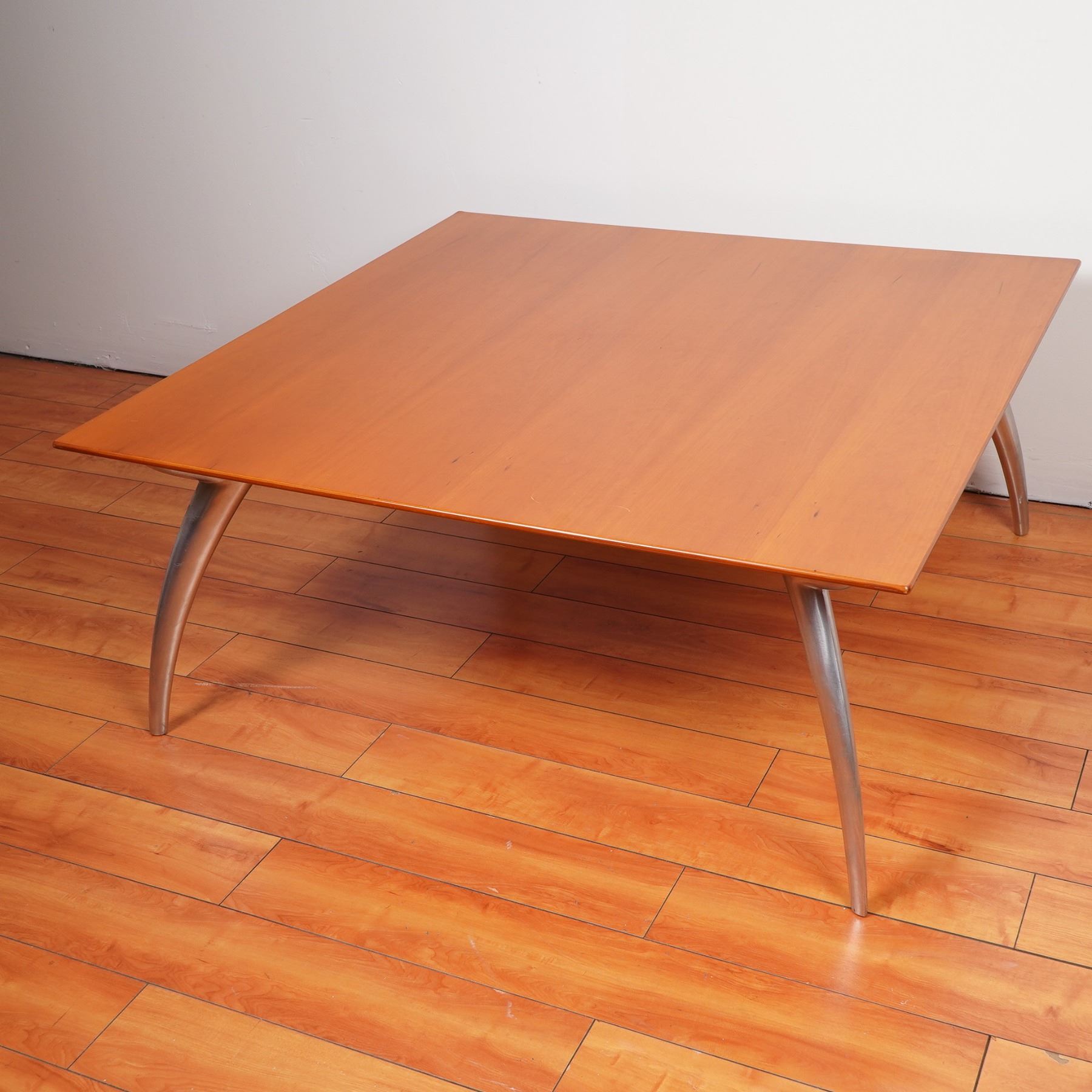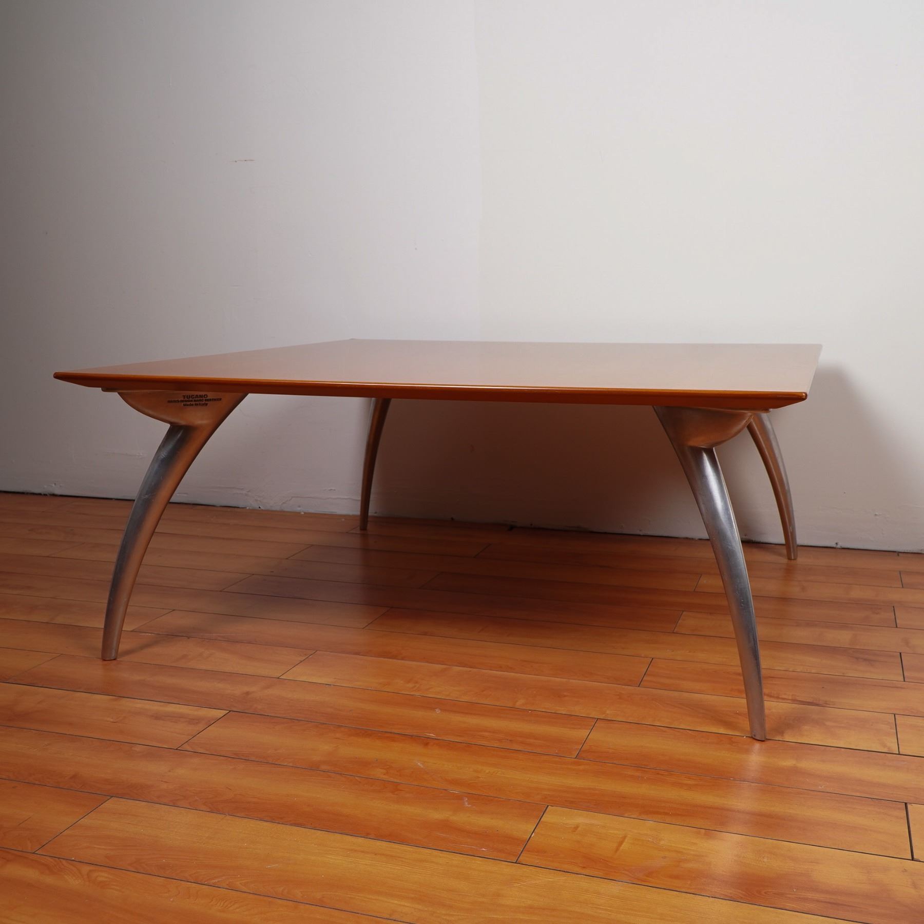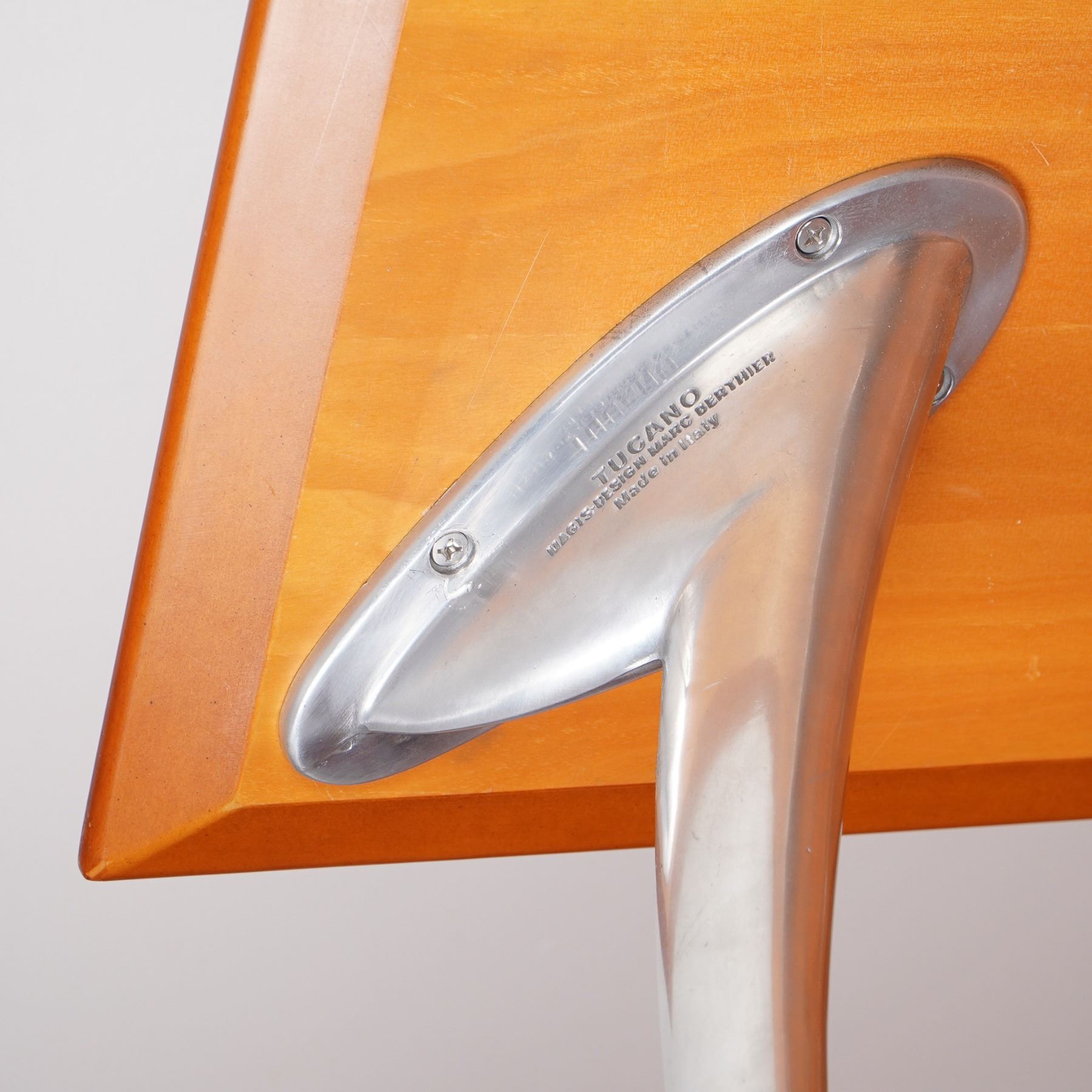 A striking Tucano coffee table designed by Marc Berthier for Magis, Italy. This modernist table features a sleek cherrywood veneer top supported by sculptural cast aluminum legs, creating a bold yet elegant aesthetic. The aerodynamic, futuristic design is a hallmark of Berthier's work, blending industrial elements with organic curvature. Marked Tucano Magis, Design Marc Berthier, Made in Italy, this piece is a sought-after collector's item in contemporary design.