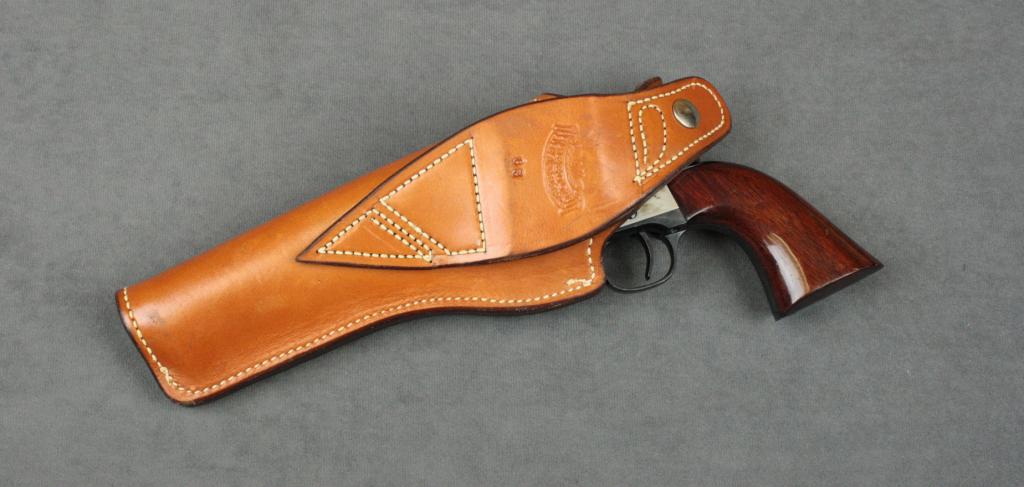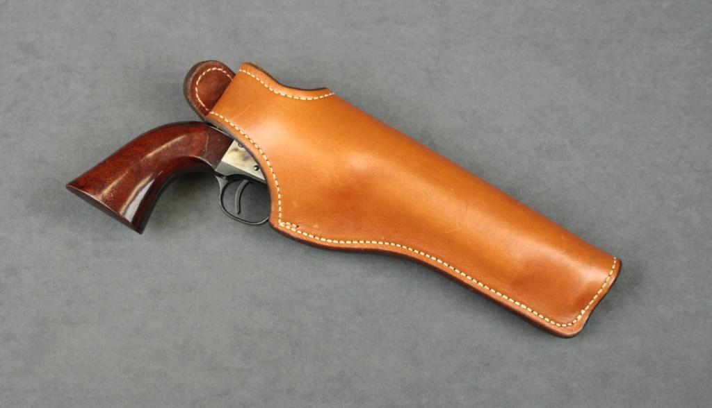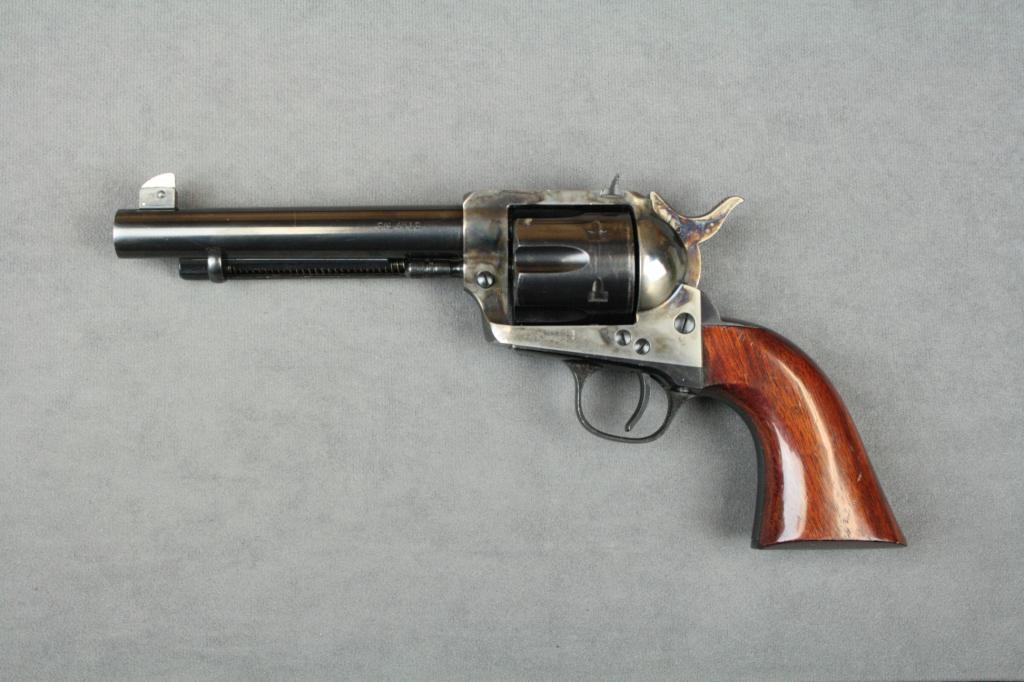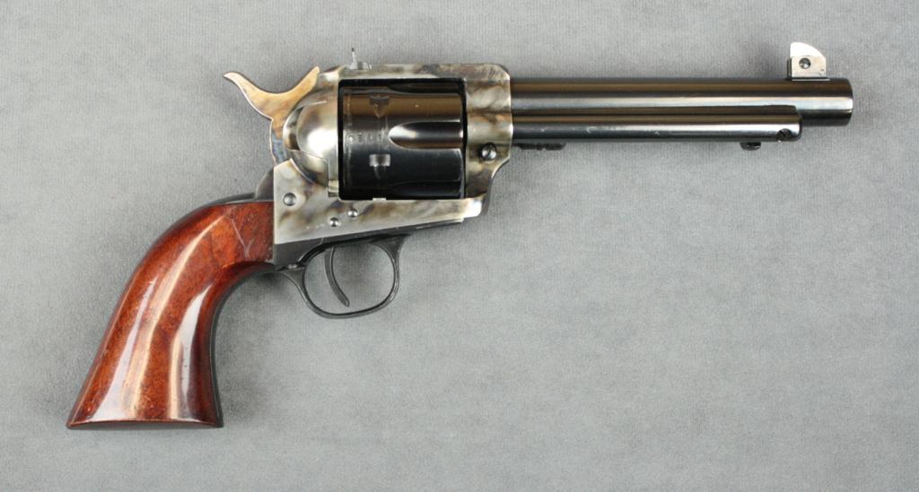 Italian Uberti flat top target copy of a Colt  SAA revolver, .45LC cal., 5-1/2” barrel,  blue and case hardened finish, wood grips,  #J39120. This gun is in overall excellent  condition showing approx. 98% original blueand approx. 98% original case colors on  frame, fine bore, action, markings and grips;  accompanied by a Freedom Leather lined belt  holster in excellent condition.  Est.:   $200-$400.