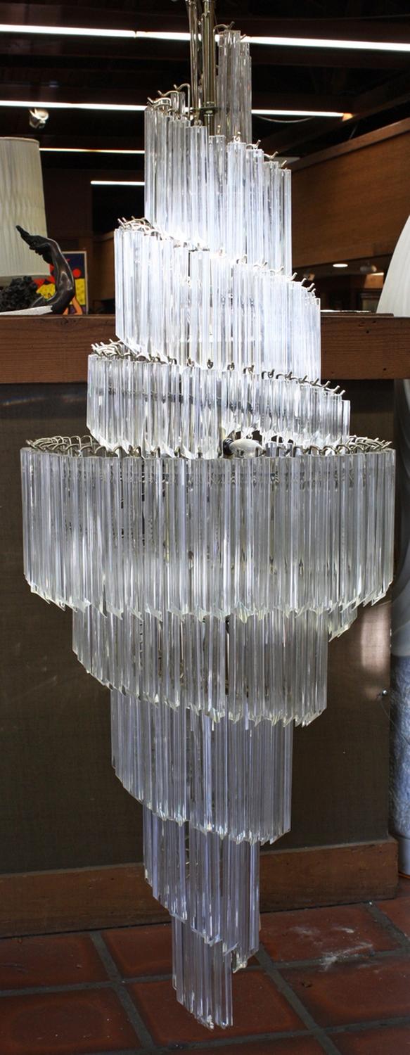 Venini chandelier, Murano Italy circa 1968, the spiral clear glass form executed in nine layers of conforming graduated star shaped rods hung on the original brass frame, 72''h x 24''w