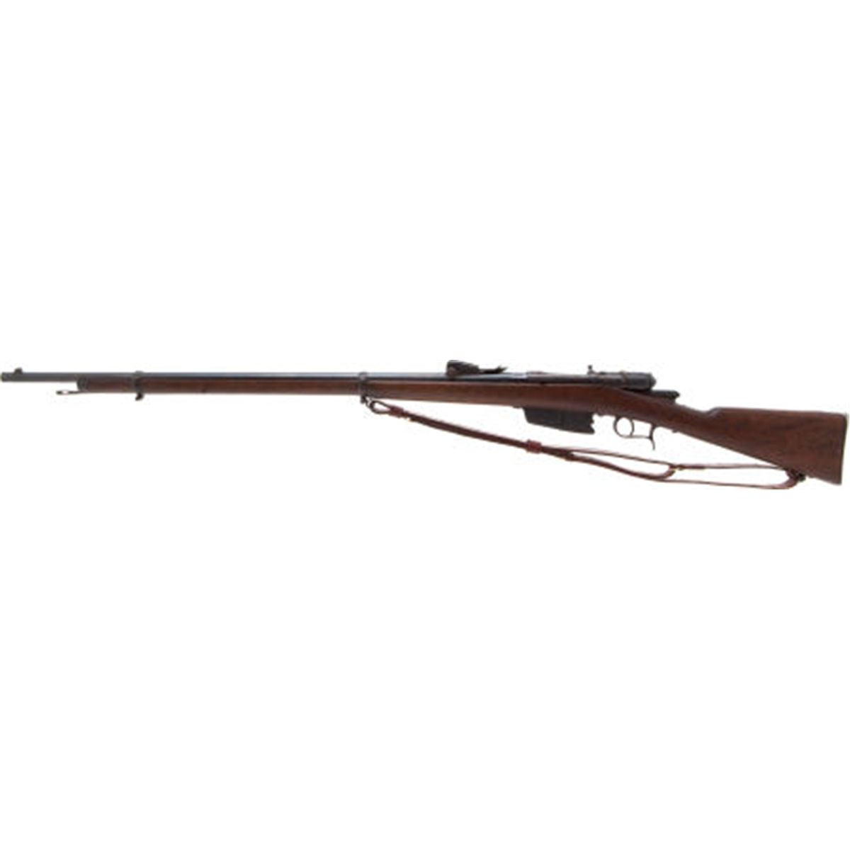 Italian Vetterli Model 1870 Bolt Action Military Rifle. Serial no.UV4191, approx. 6.5mm. 34-inch barrel with standard military sight configuration. Dated 1876 at breech. Blued finish. Bolt action. Spurred triggerguard. Walnut stock with sling mounts. Modern military style leather sling. Steel ramrod. Condition: Very good. Retaining approximately 75-85% reblued finish with scattered wear and age patina. Wood very good with light wear and minor marks. Action good. NRA FIREARMS FOR FREEDOM PROGRAM