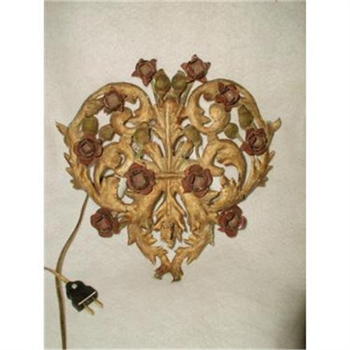 Heart shaped Italian Victorian metal wall sconce in open work gilt garland background C.1920. Applied relief raised dark rose to deep red rose vine with green leaves are laced throughout the gilt. Bottom of the heart curves outward away from wall. Holds two small based bulbs in back so that the light shines through the open work giving a soft glow when let. Plug on end of 30 inch cord. Measures 11H X 12L X 2.5D. Has been rewired,works wonderfully and in excellent condition.