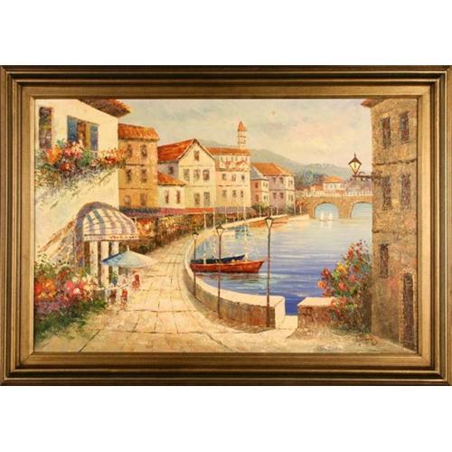James? updated, modern painting is fashioned in the style of the great Impressionists. He depicts a quiet, sunny, Italian village light painterly strokes with a flair for capturing the time of day. With skillful choice of coloring, and active brushwork, he creates the full intensity of stunning daylight in this seaside village scene.