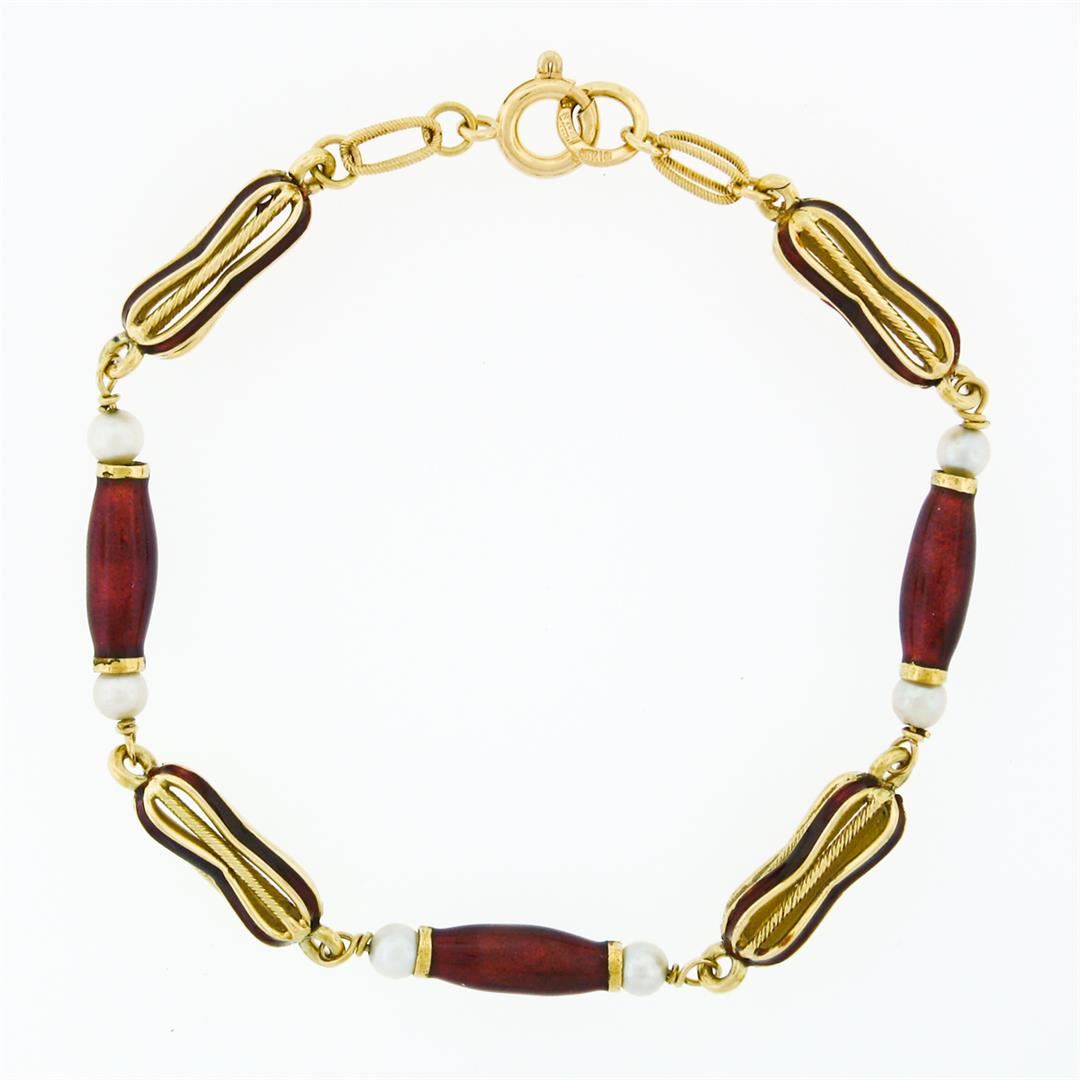 A vintag solid 18k yellow gold and enamel link bracelet, faeturing 6 round shape natural cultured pearls (3.65 - 3.75mm ). It weighs a total of 15.3 grams, and measures 7.5 inches in length.