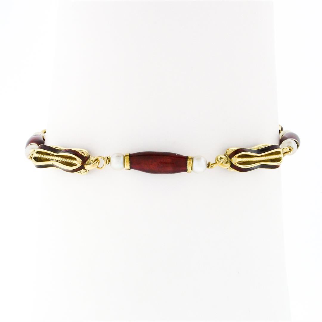 Italian Vintage 18K Yellow Gold Red Enamel & Pearl Detailed Fancy Link Bracelet