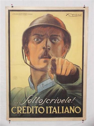 Italian WWI Poster, "…Sottoscrivete! Credito Italiano", Artist-Mauzan, Printer-Atelier-Butteri-Torino, 55" x 39", Condition – Good: Corner and Fold Creasing, Small Border Tears and Losses, Soiling; Linen Backed,