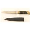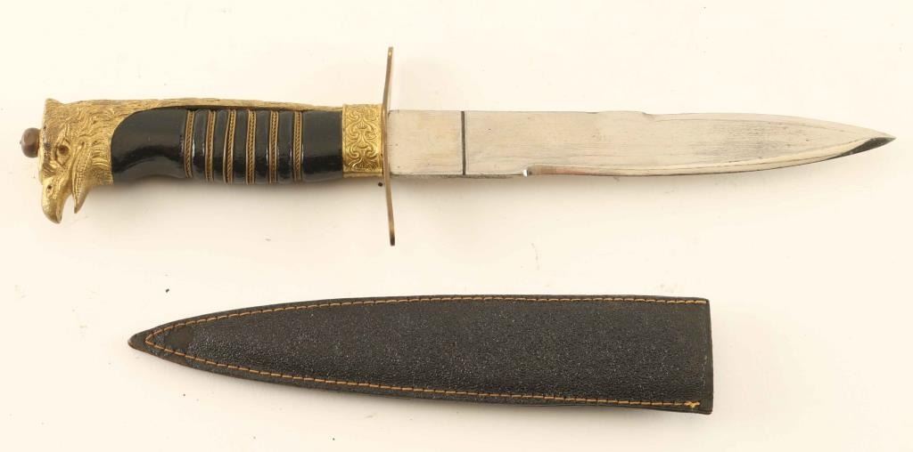 Black wood handle gold wire wrapped with eagle head, high polished 6.5" blade with correct leather scabbard.
