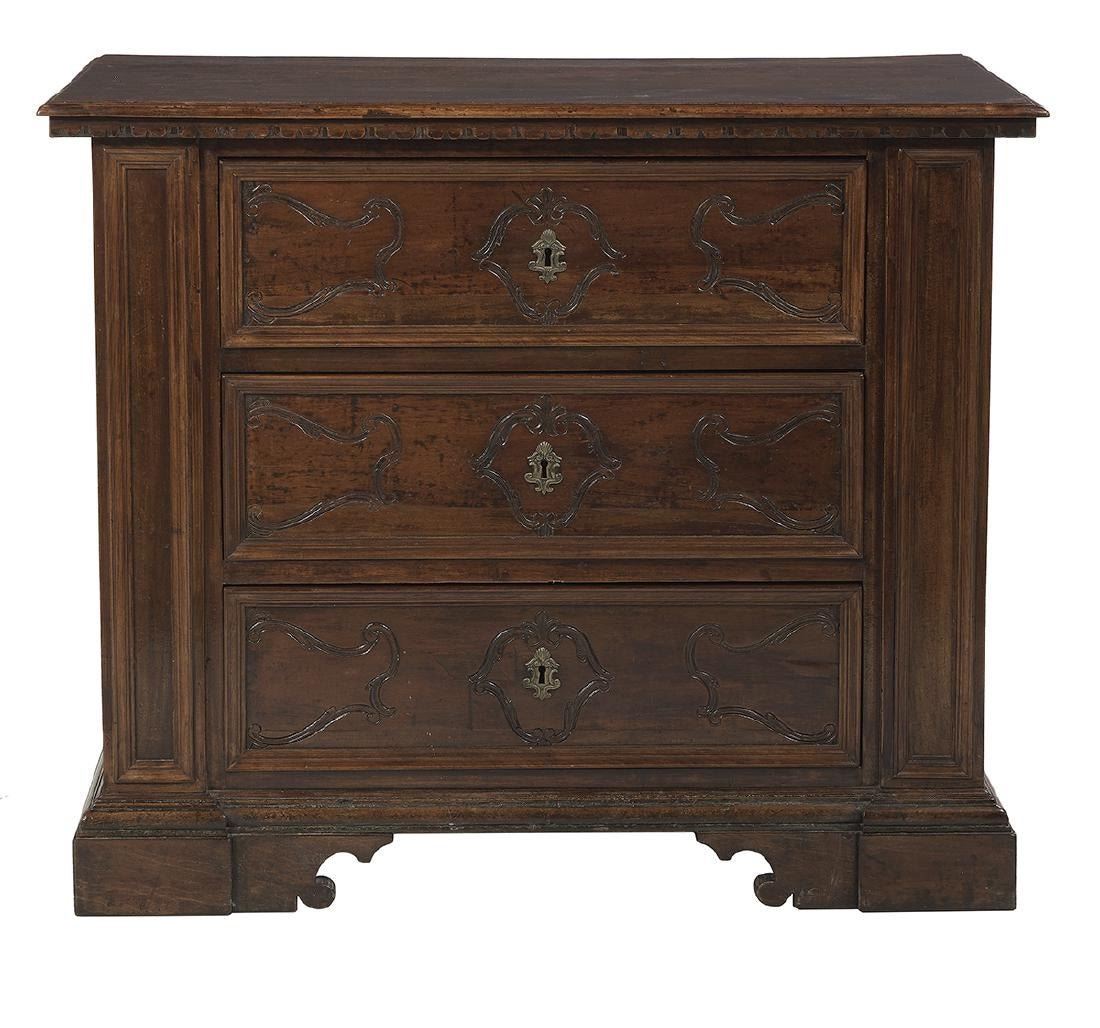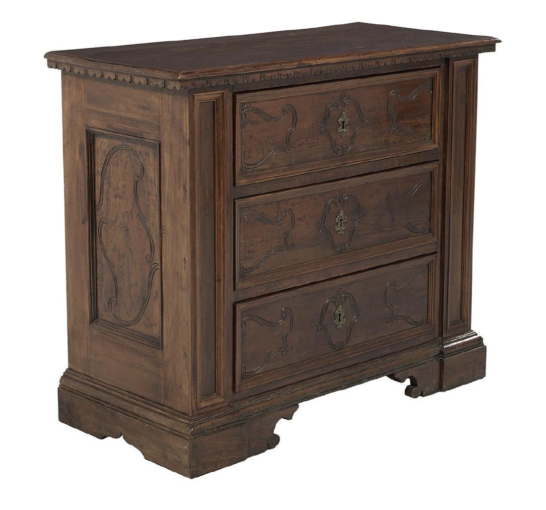 19th century, the rectangular top with a molded edge, above a conforming case fitted with three long paneled drawers, all with incised scrolling patterns and all flanked to either side by a paneled upright, raised on bracket feet. h. 39-3/4", w. 46-1/2", d. 21-1/2"