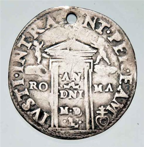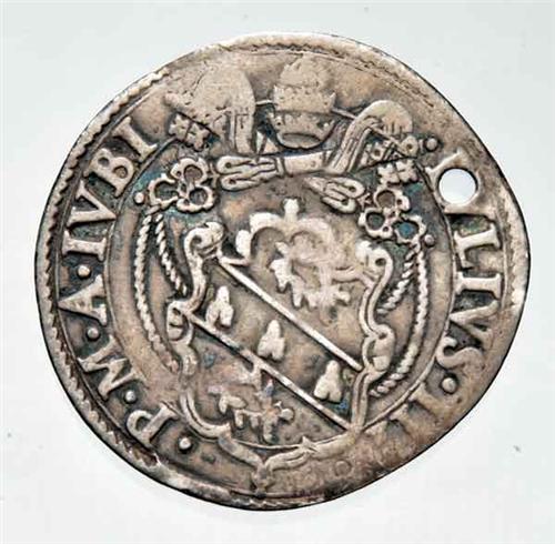 Italian XVI - XVIII Centuries - Ag Cu - Giulio III (1550-1555) - Giulio giubilare 1550 - Zecca: Roma - Diritto: stemma sormontato dalle chiavi decussate e dalla tiara - Rovescio: la Porta Santa - gr. 2,89 - Forata - In lotto con altre tre monete d'argento e una di rame di Sedi Vacanti diverse - Da esaminare