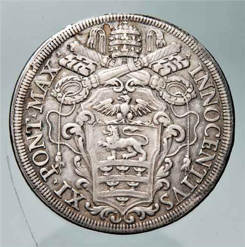 Italian XVI - XVIII Centuries - Ag - Inocenzo XI (1676-1689) - Piastra 1691 - Zecca: Roma - Diritto: stemma sormontato dalle chiavi decussate e dalla tiara - Rovescio: San Pietro in trono si rivolge benedicente verso destra - gr. 31,62 - Lieve traccia di appiccagnolo - Da esaminare