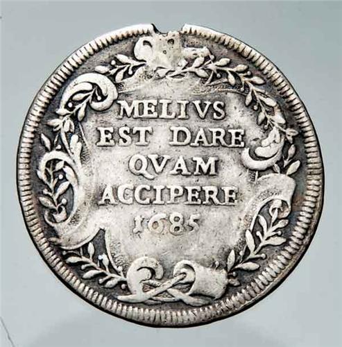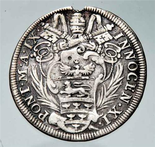 Italian XVI - XVIII Centuries - Ag - Innocenzo XI (1676-1889) - Testone 1685 anno IX - Zecca: Roma - Diritto: stemma sormontato dalle chiavi decussate e dalla tiara - Rovescio: motto e data entro cartella a volute circondata da una corona d'alloro - gr. 8,92 - Mancanza di metallo al contorno per rimozione di appiccagnolo