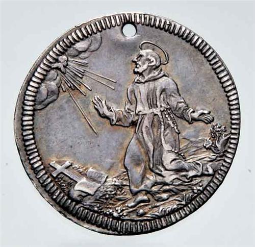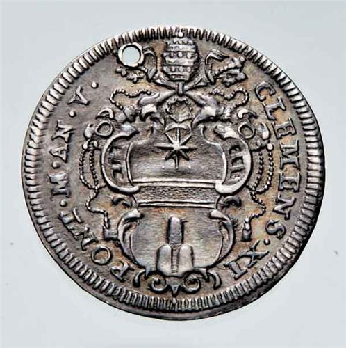 Italian XVI - XVIII Centuries - Ag - Clemente XI (1700-1721) - Giulio anno V - Zecca: Roma - Diritto: stemma sormontato dalle chiavi decussate parzialmente nascoste e dalla tiara - Rovescio: San Francesco genuflesso a sinistra riceve le stimmate - gr. 3,01 - Forata, ma di buona qualità - Da esaminare