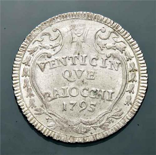 Italian XVI - XVIII Centuries - Mi - Pio VI (1775-1799) - 25 Baiocchi 1795 anno XXI - Zecca: Roma - Diritto: tiara e chiavi decussate - Rovescio: motto e data entro cartella sagomata e ornata di fogliami - gr. 10,55 - Di buona qualità
