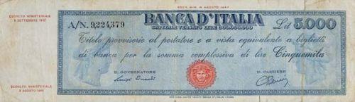 Italian banknotes - Titolo provvisorio da 5.000 Lire "Medusa" - D.M. 8/9/1947 (Rep. Italiana) - Pieghe, strappetti e macchie - Qualità modesta - Da esaminare -