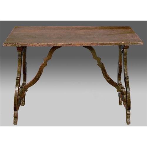 Italian baroque walnut table with rectangular top raised on lyre supports joined by shaped stretchers. 29 1/2"H x 42"W x26"D.