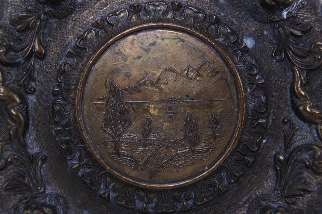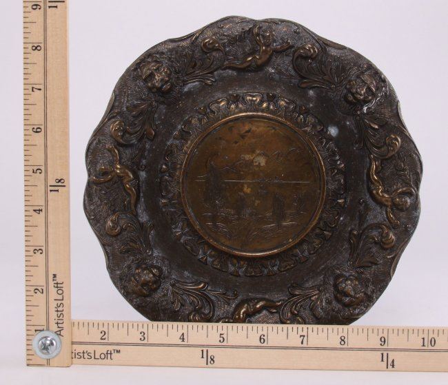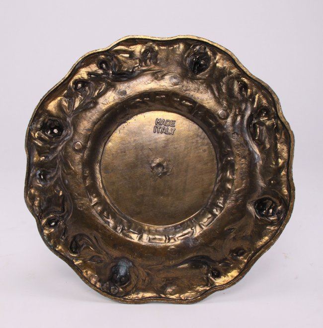 Italian brass/bronze plate with decorated with lions, cherubs, flowers, and a Mediterranean water view, mid 20th Century. (Size: See second photo for measurement.) Photos are part of the description representing the condition report. Pangaea Auctions urges Bidder's to view all attached photos.