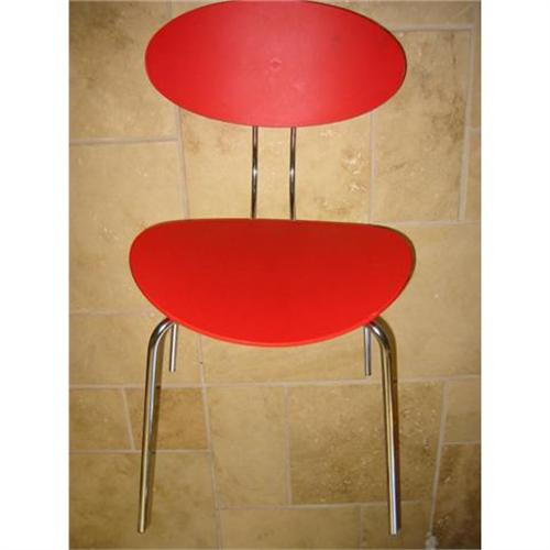 set of 4 decorative plastic and chrome italian chairs. they are in great condition, useful for kitchen or nook or in child's room. they are also wonderful for the garden as well. attractive red, nice and chic. measures approx. 32.5 inch tall , back support about 18.5 inch, and seating almost the same. they all have itlian writing and numbers. something to think about.