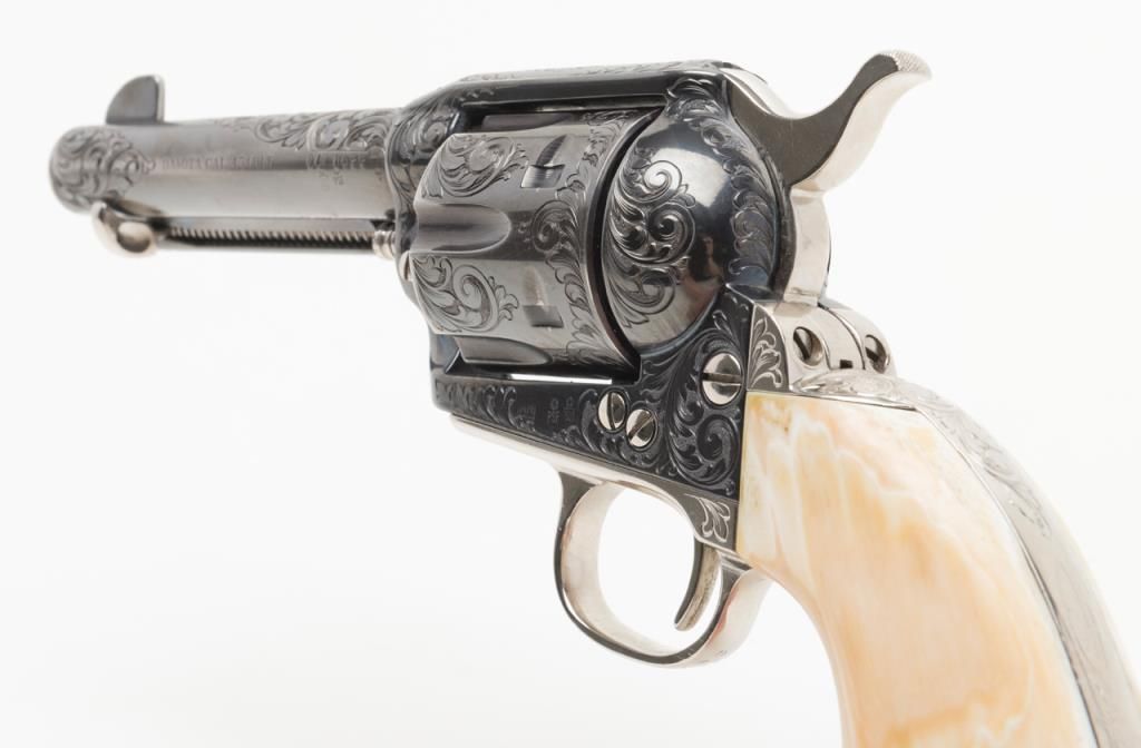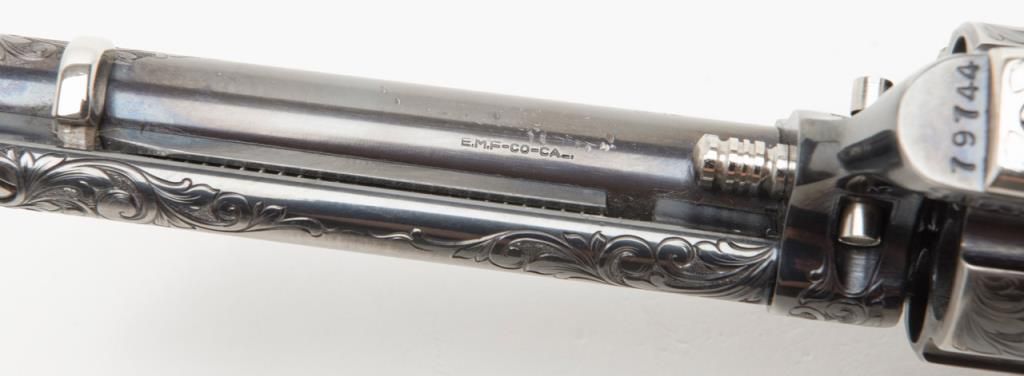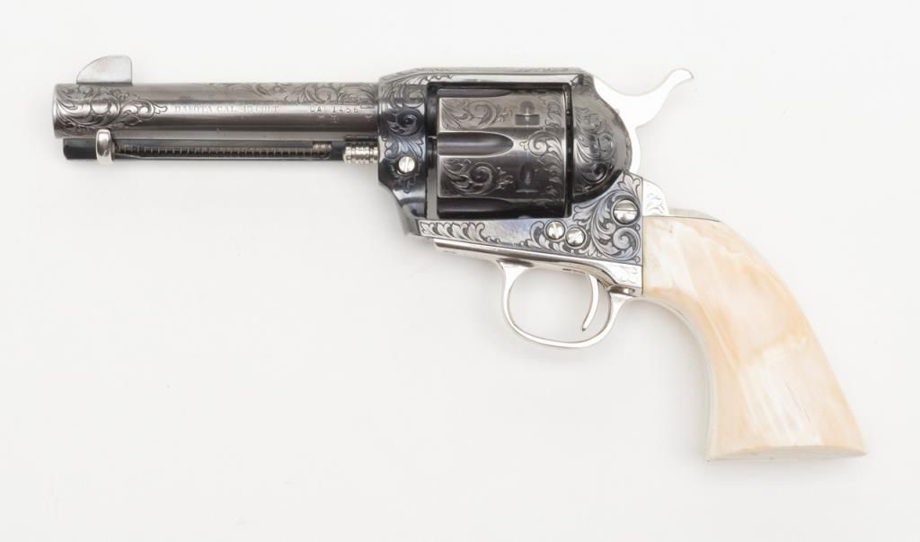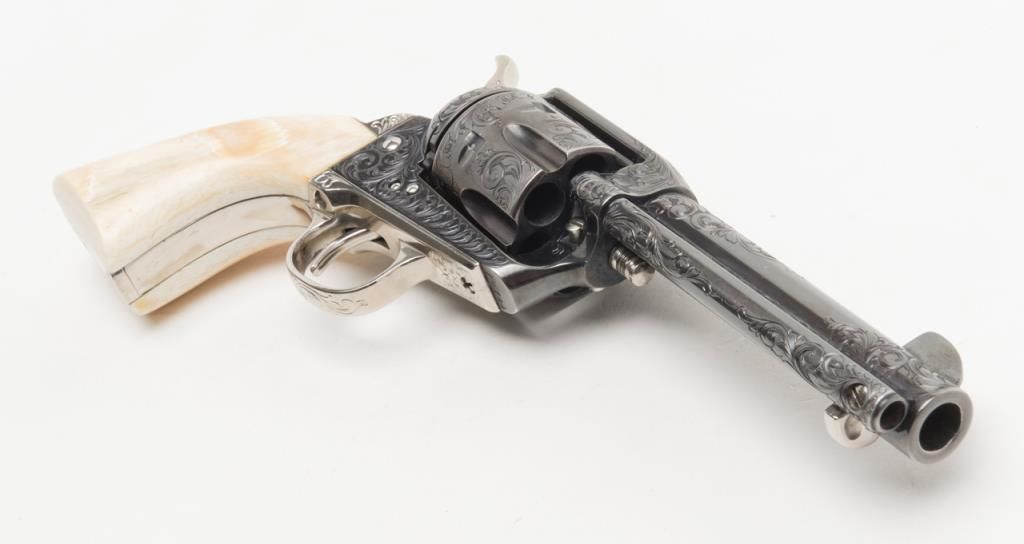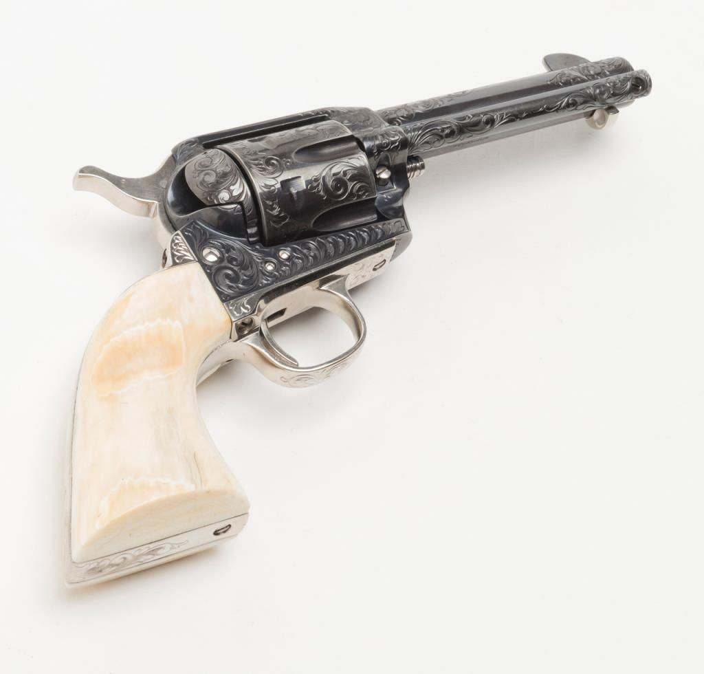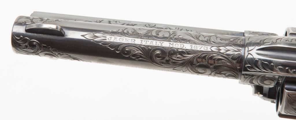 Italian copy of a SAA by Jaegar, .45 cal., 4-3/4” barrel, blue finish with nickeled accenting, engraved with ivory grips, #79744 in overall good condition, used by Boyd Davis, co-founder of SASS and CEO of EMF at beginning of Cowboy ActionShooting era. (C&R/PPT). Est.: $750-$1,500.