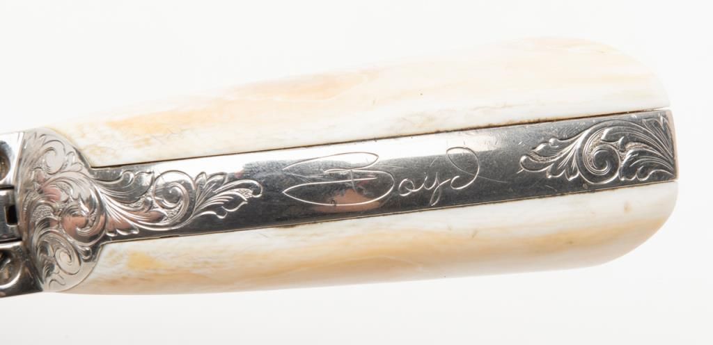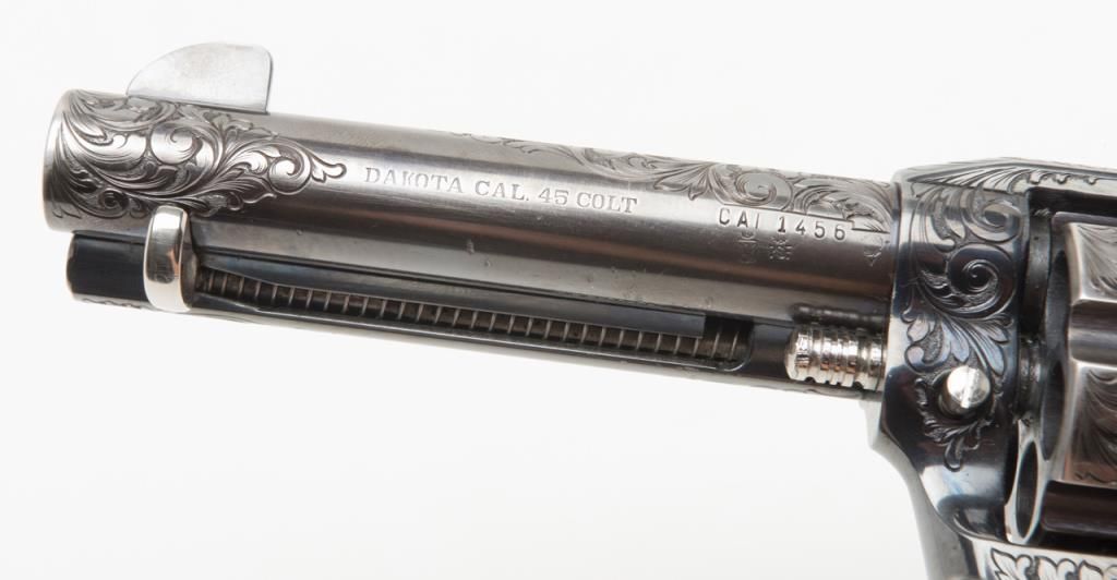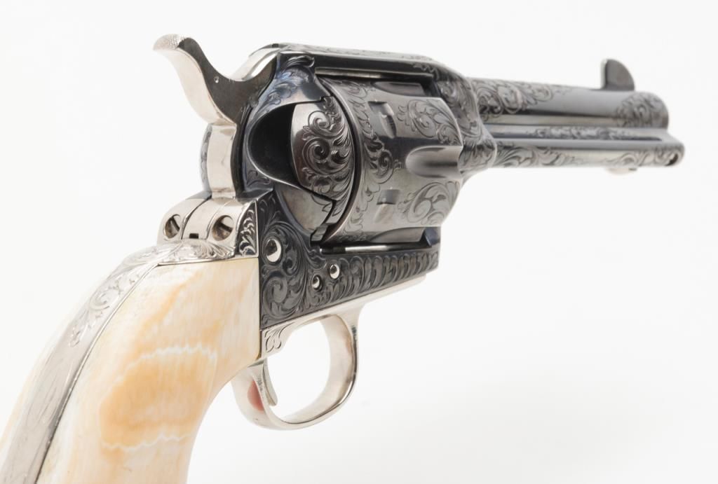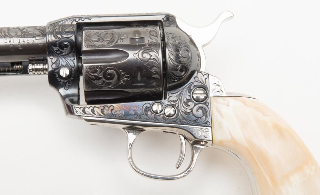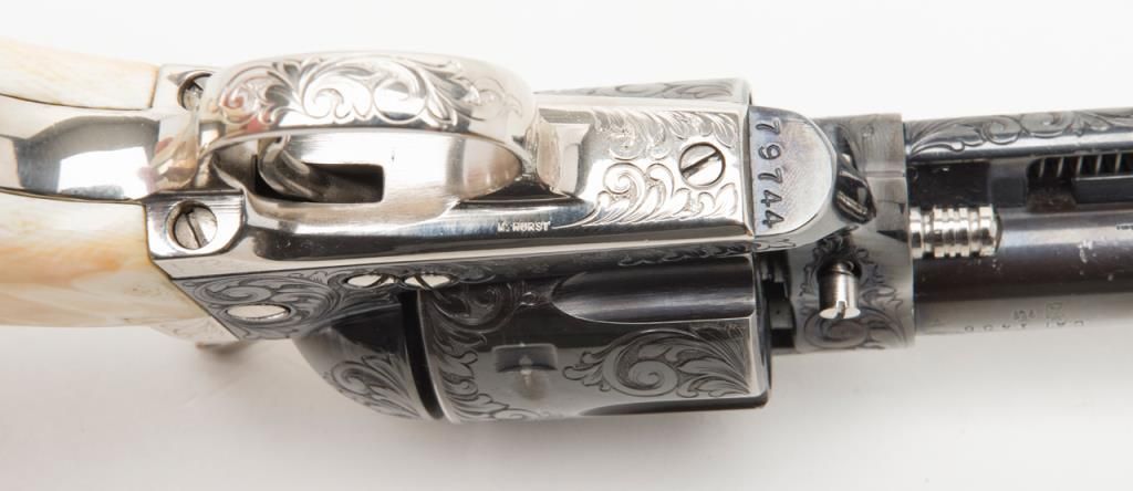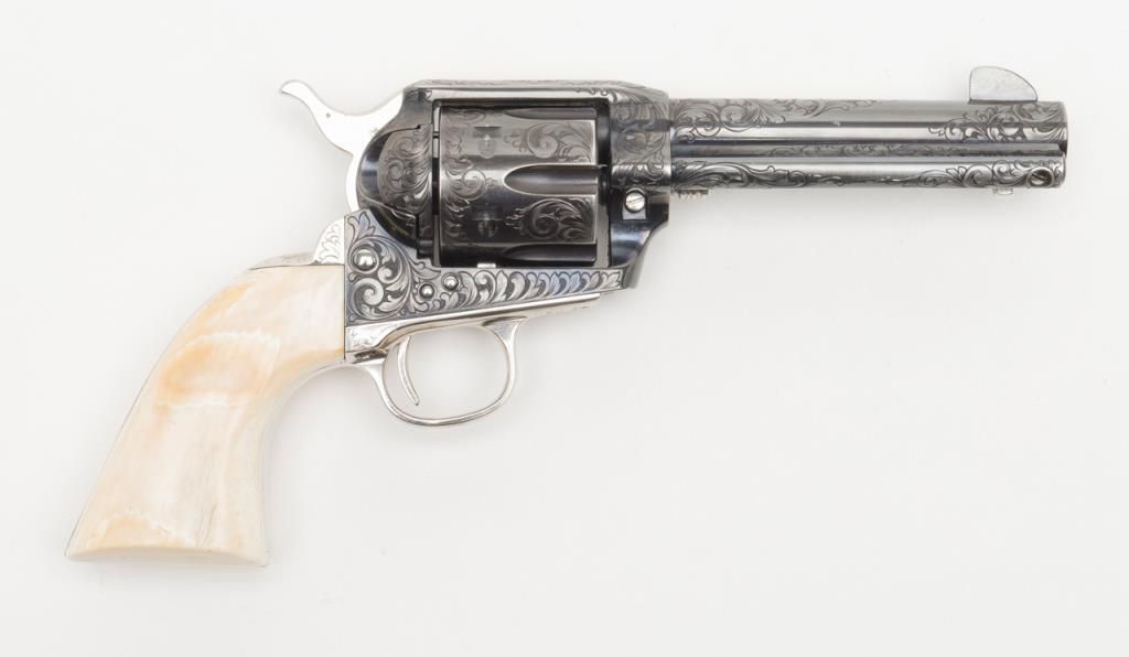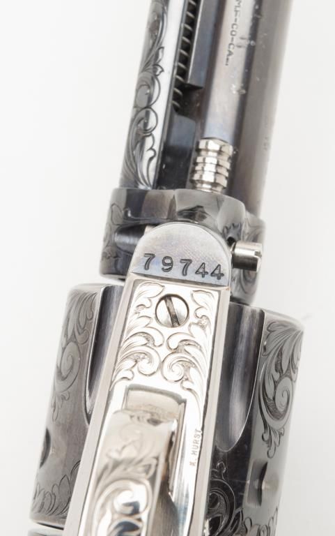 Italian copy of a SAA by Jaegar, .45 cal., 4-3/4” barrel, blue finish with nickeled accenting, engraved with ivory grips, #79744 in overall good condition, used by Boyd Davis, co-founder of SASS and CEO of EMF at beginning of Cowboy ActionShooting era. (C&R/PPT). Est.: $750-$1,500.