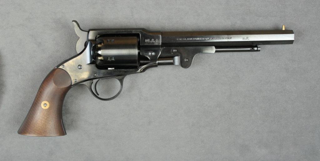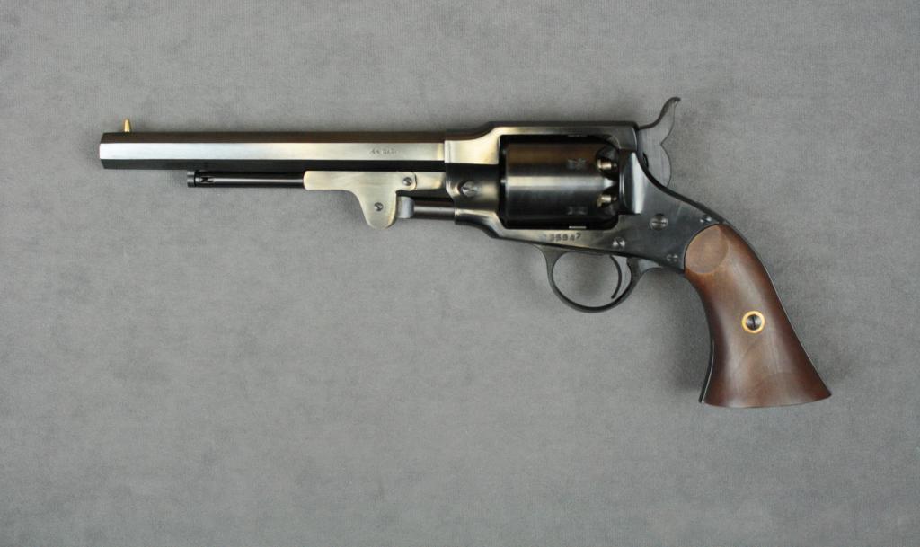 Italian copy of a Spencer Civil War era percussion revolver, .44 cal., 7-1/2” octagon barrel, blue finish, wood grips, #025847. This gun is in like new condition with accessories including a repro powder flask,cap tin, capping tools and powder measurer. Est.: $200-$400.