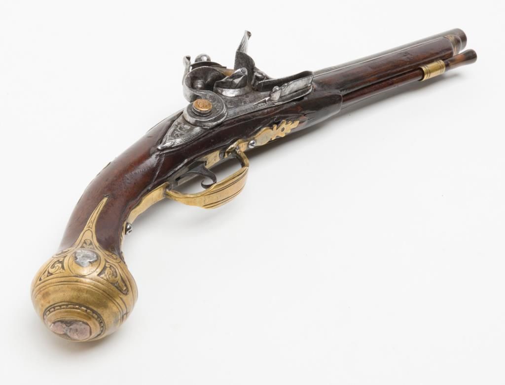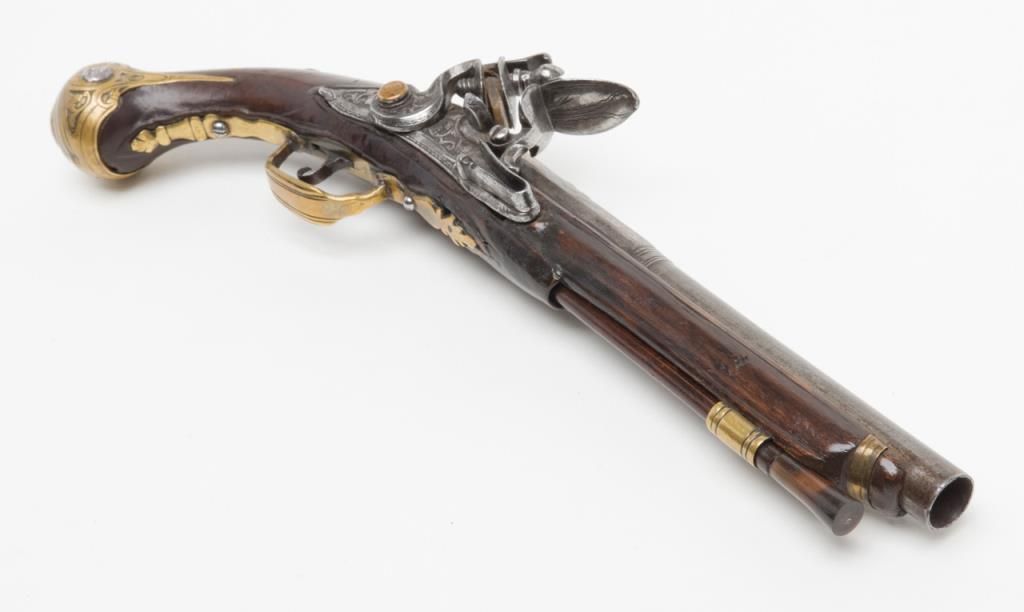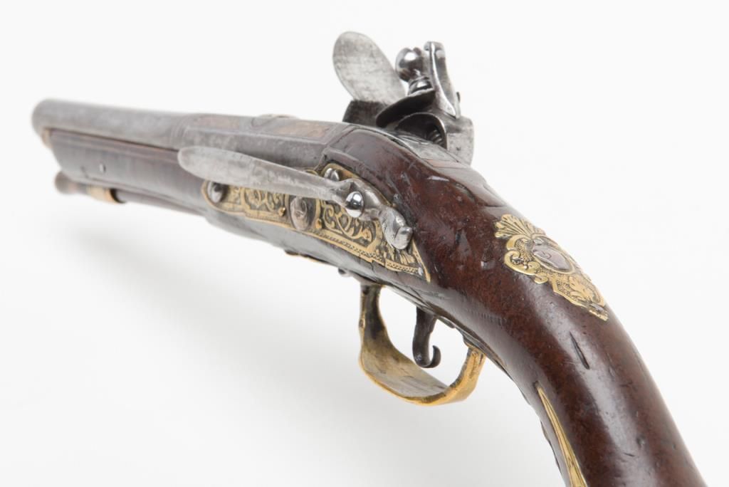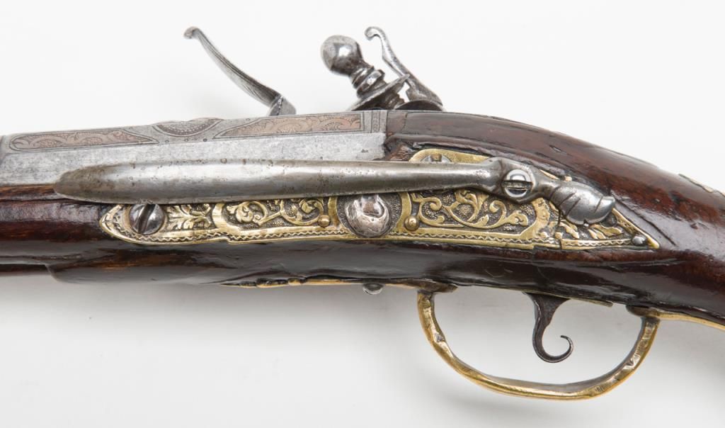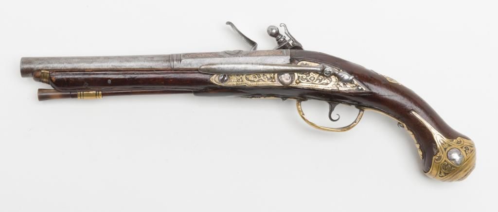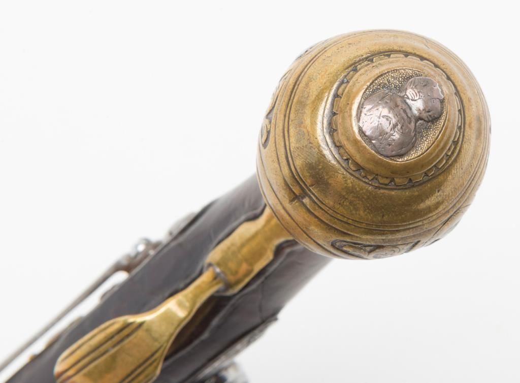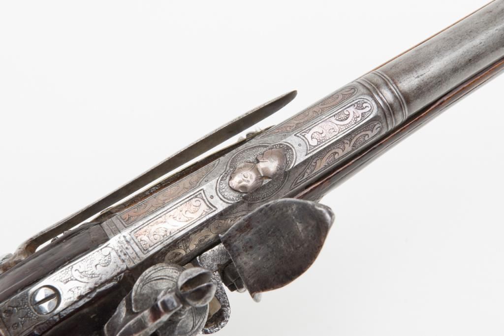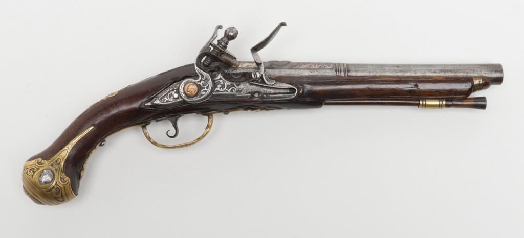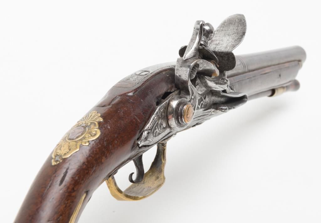 Italian flintlock pistol, circa 1725-1760; 13-1/2” overall with an 8” engraved barrel, chiseled steel lockplate and hammer, brass mountings with silver accents, wood stock showing several age cracks; horn-tipped wood ramrod; belt hook;working action; overall pleasing patina to metal surfaces and wood. (Antique). Est.: $1,250-$2,500.