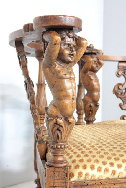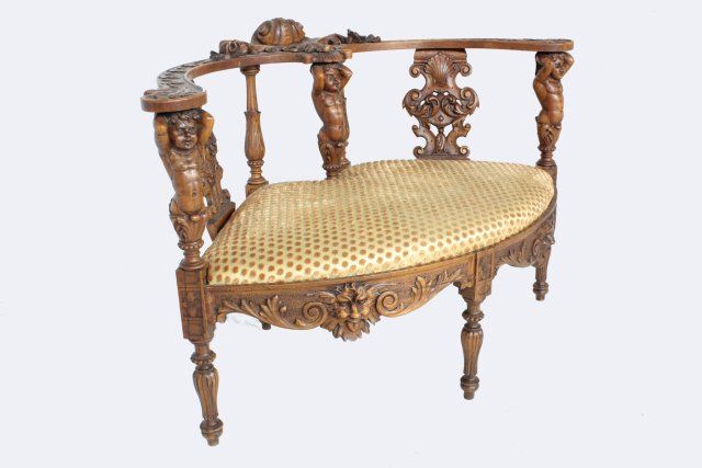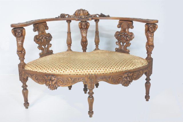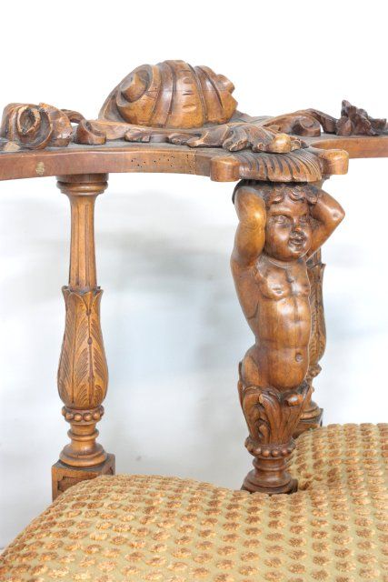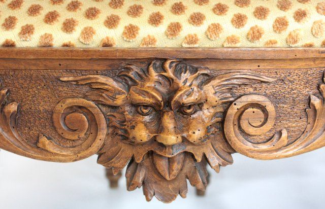 Heavily carved, scroll top, "Lions Heads" carved into base, very rare & unusual, ca. 19th c. Approx. 31" H x 31" D x 45.5" W. Please read our terms of sale.