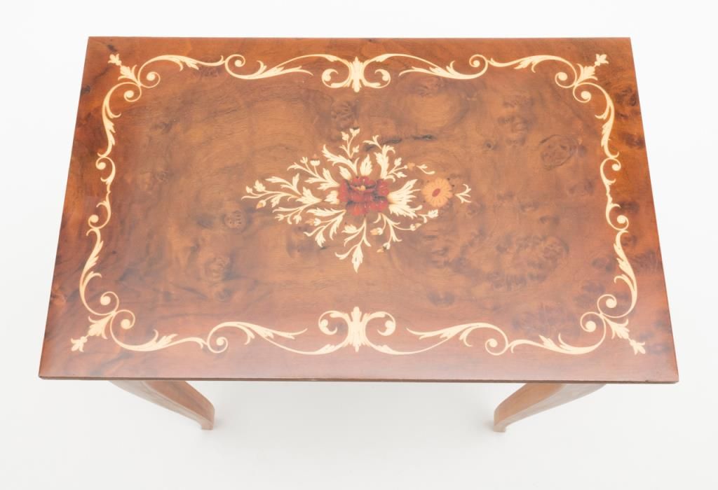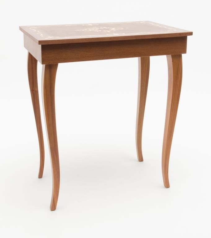 Italian inlaid table in French style, approx. 20” in height, 18” x 11-1/2” table top with lined interior for a pair of pistols when lid of table raised. Est.: $175-$350.