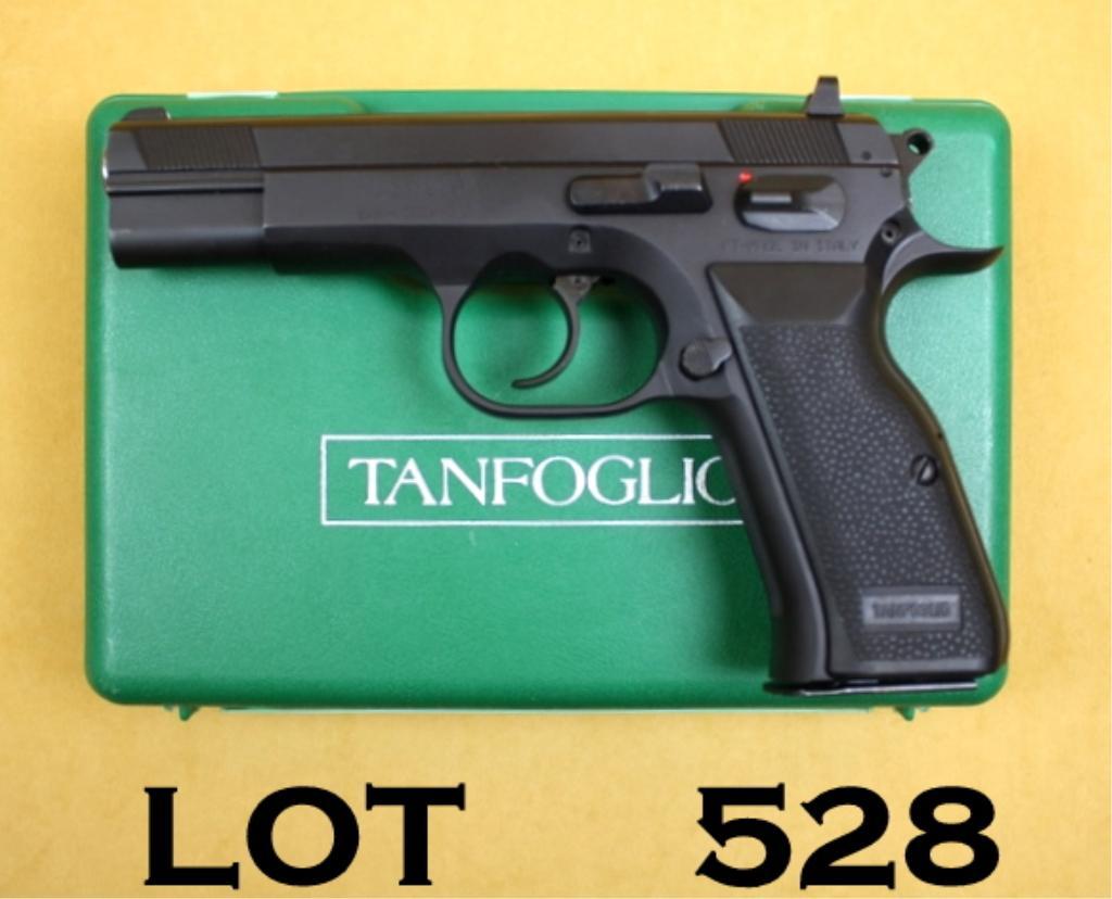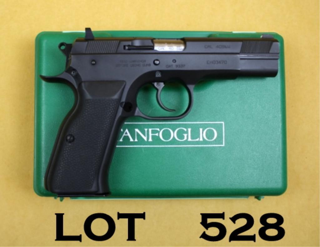 Italian-made Tanfoglio Winess Model DA semi-auto pistol, .40 S & W cal., 4-1/2” barrel, matted black finish, black hard rubber grips, #EA03470. This gun is in overall excellent condition showing little use and some light high point wear, excellent bore, crisp action and markings, very good grips, accompanied by factory green hard plastic carry case. Est.: $300-$500.